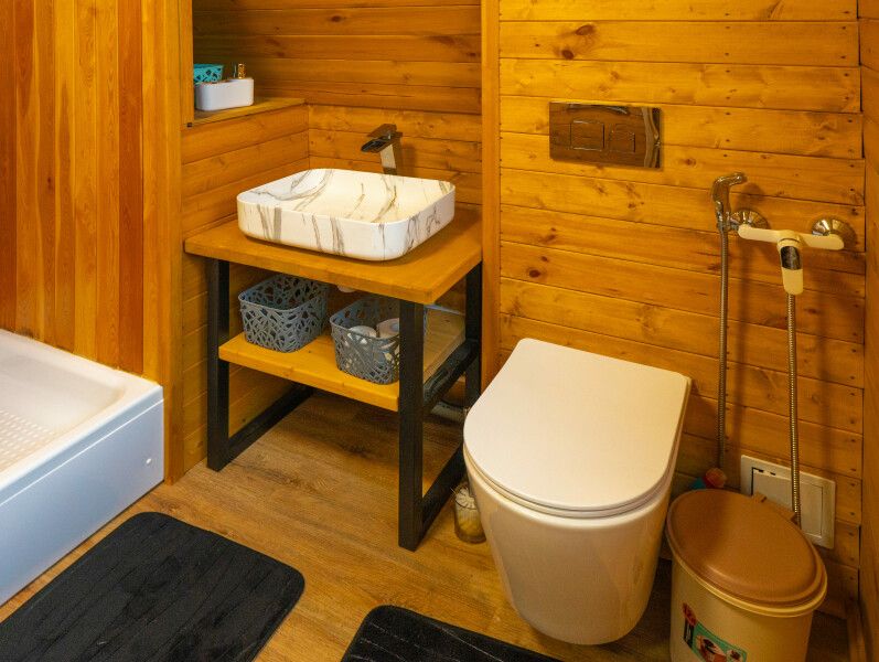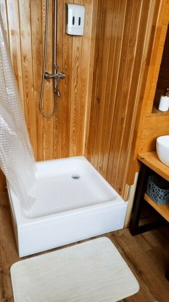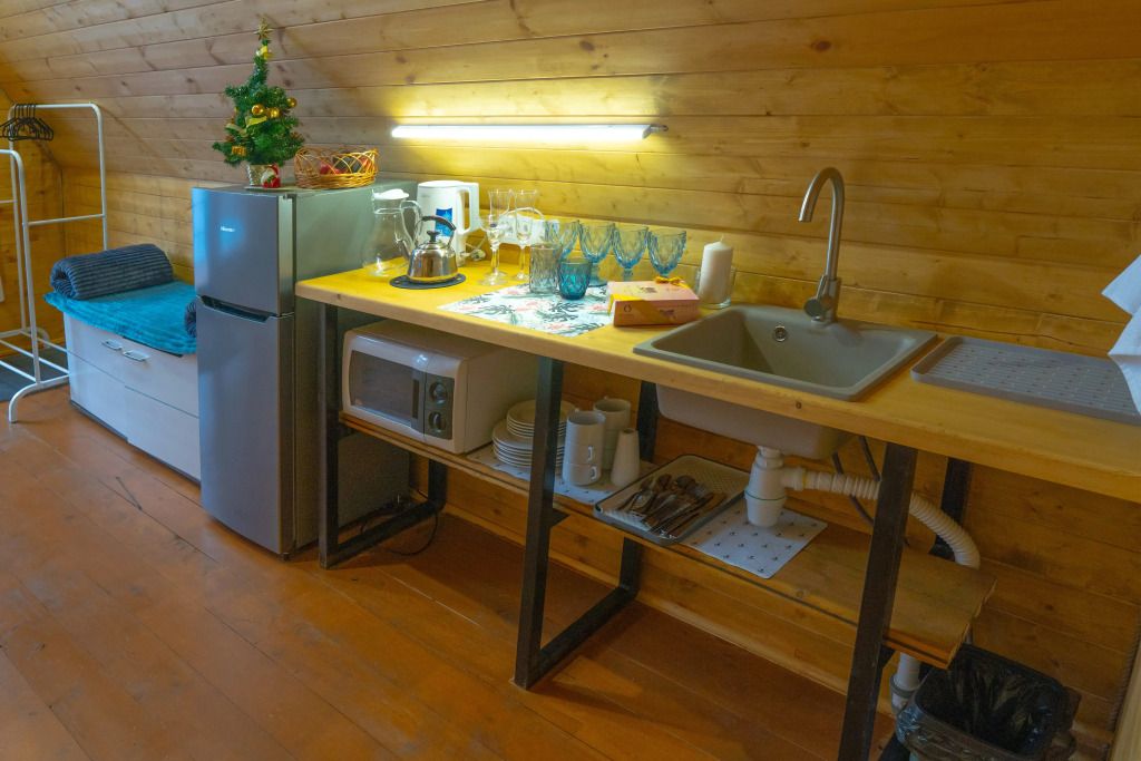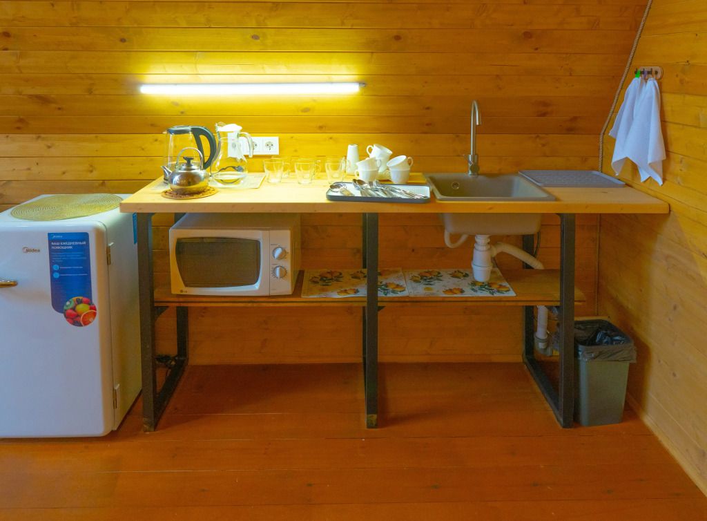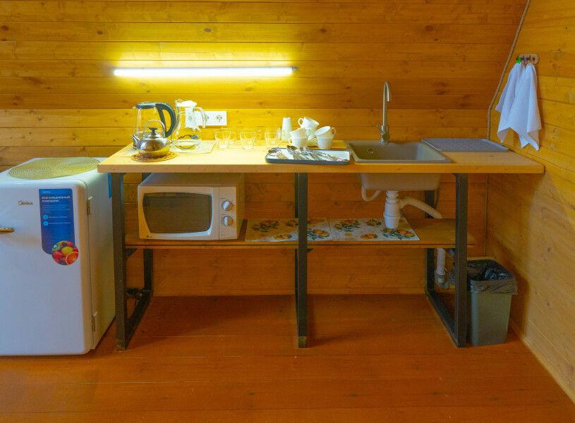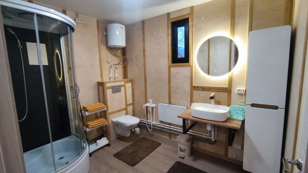В распоряжении гостей телевизор с «Алисой» (смарт ТВ), Wi-Fi, холодильник, микроволновка, чайник, комплект сервировочной посуды, компактный обеденный стол. Индукционная плита и посуда для приготовления — по запросу. Санузел: душевая кабина с радио, унитаз с гигиеническим душем, умывальник.