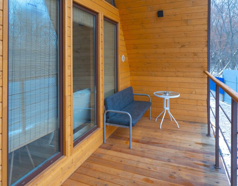 Площадь дома — тридцать шесть метров и веранда двенадцать метров. Одна спальня, кухня-гостиная, санузел. Вместимость номера: спальные места — два основных спальных места (двуспальная кровать с анатомическим матрасом) с комплектом постельного белья и полотенец.