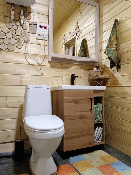 В доме есть теплые полы, санузел с душевой кабиной, баня на дровах (за дополнительную плату).