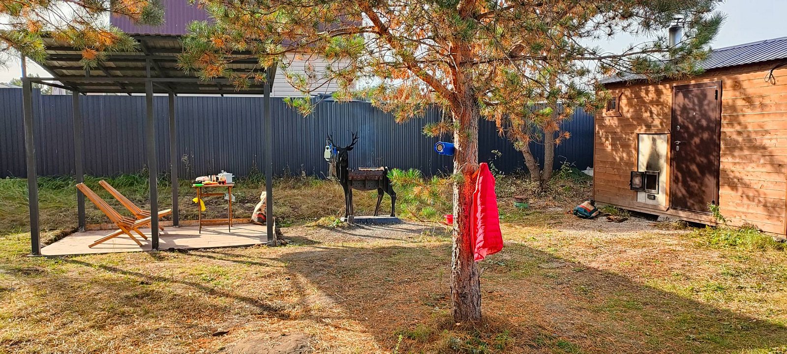 На территории — баня, мангал-олень, несколько сосен, гамак, парковочное место