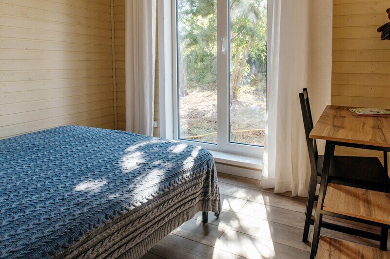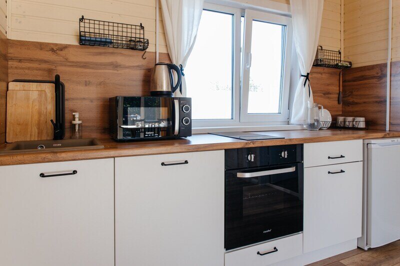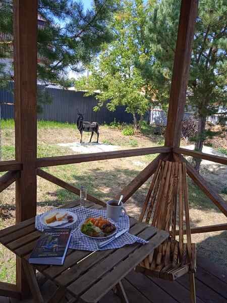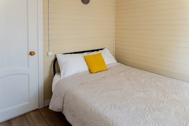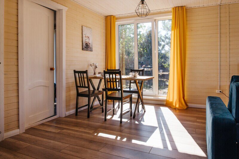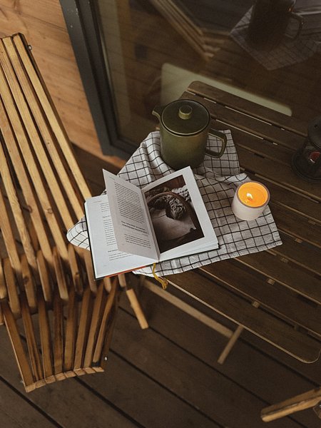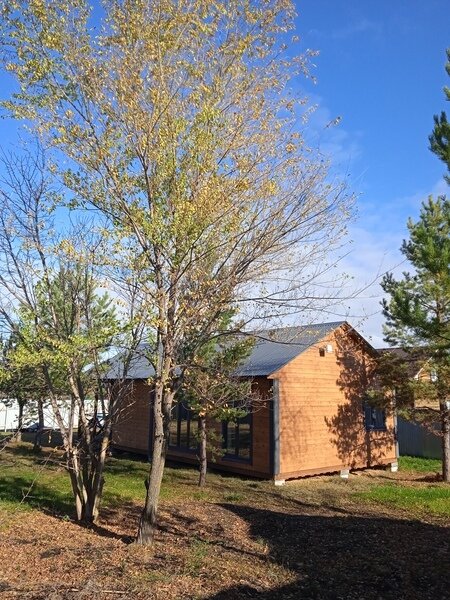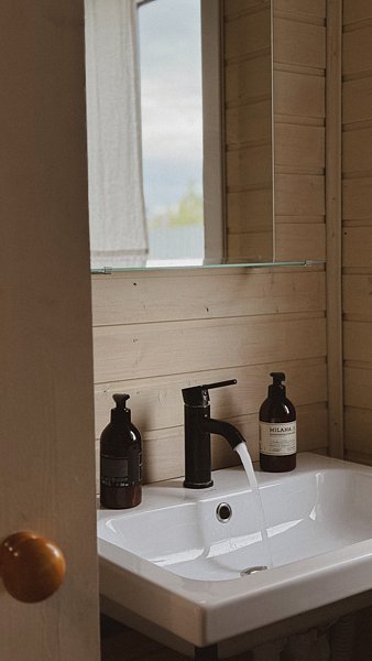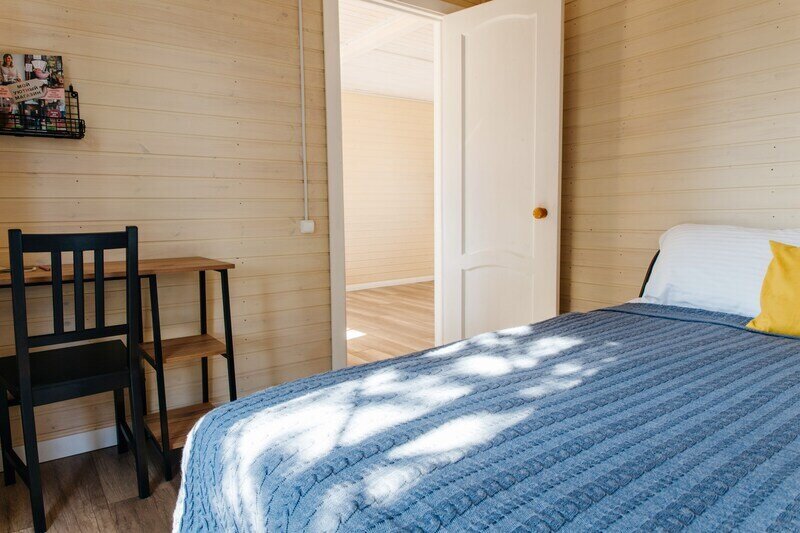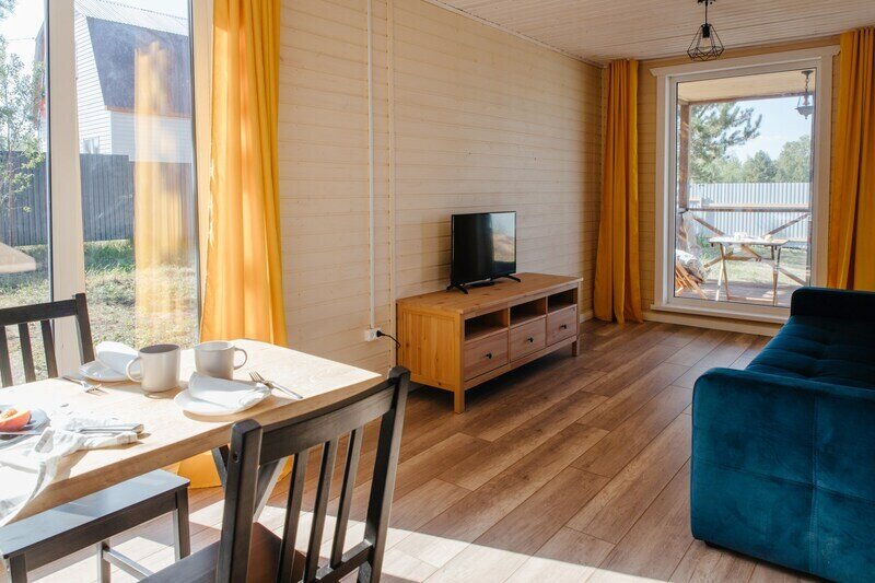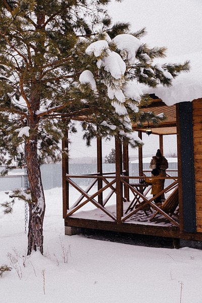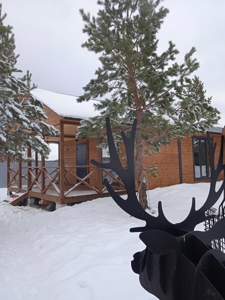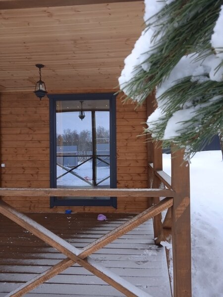 В доме вы найдёте две отдельные спальни, санузел с душем, просторную кухню-гостиную, веранду, настольные игры и виниловый проигрывать с пластинками. Из панорамных окон открывается вид на территорию. Рядом простирается лес, в котором можно увидеть зайцев, куропаток и косуль.