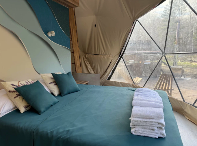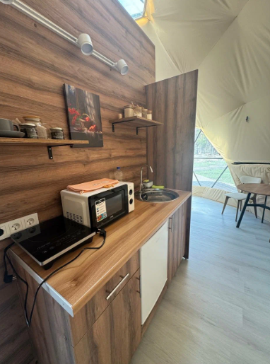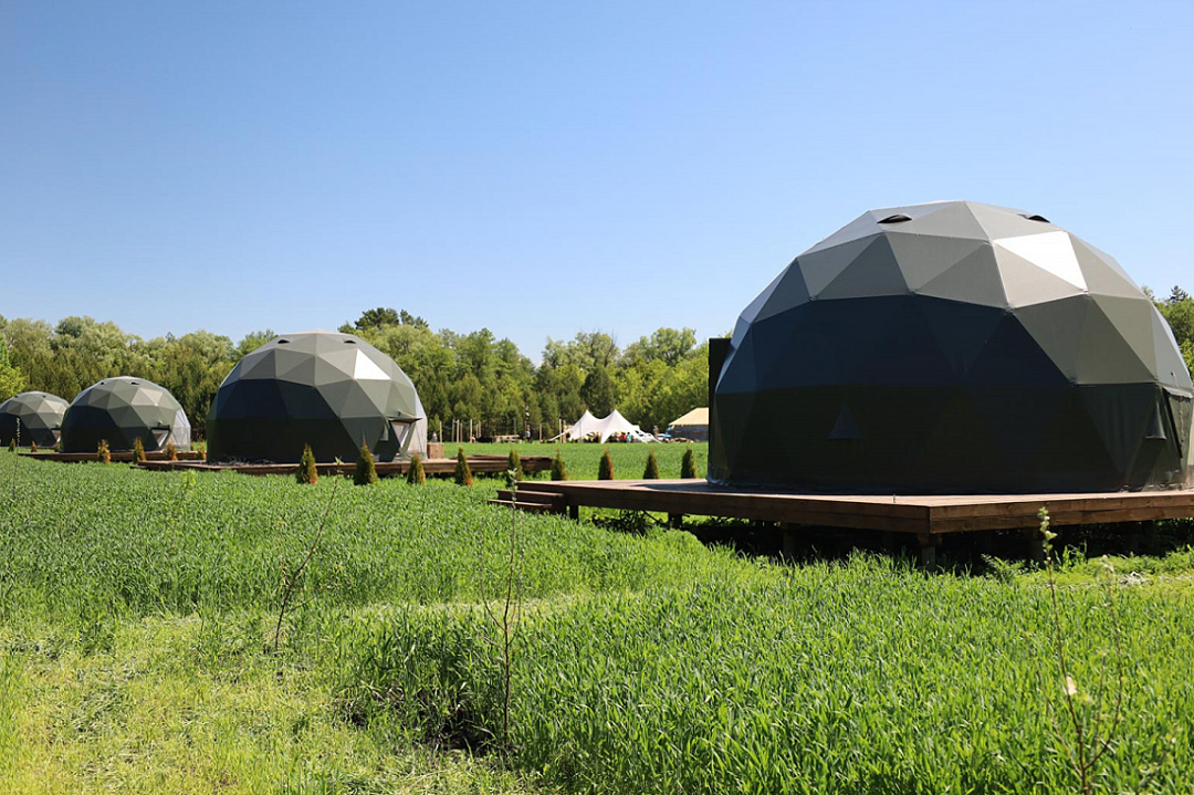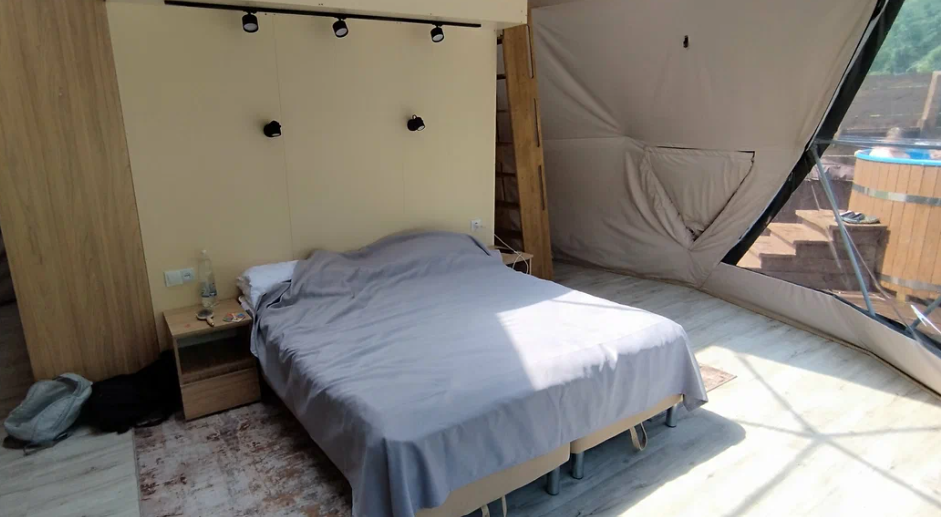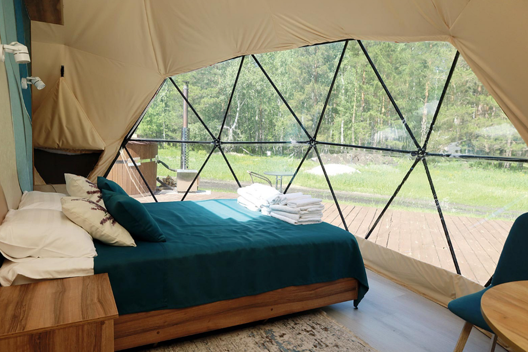 - комфорт и уют: гостевые домики или геокупола оборудованы всем необходимым для комфортного проживания: от удобных кроватей до электричества и даже ванных принадлежностей;