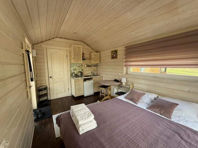 В домиках есть все для комфортного отдыха: на втором этаже — кровать с видом на звездное небо, на первом этаже — большая кровать; кухня, ванная комната, обеденный стол со стульями.