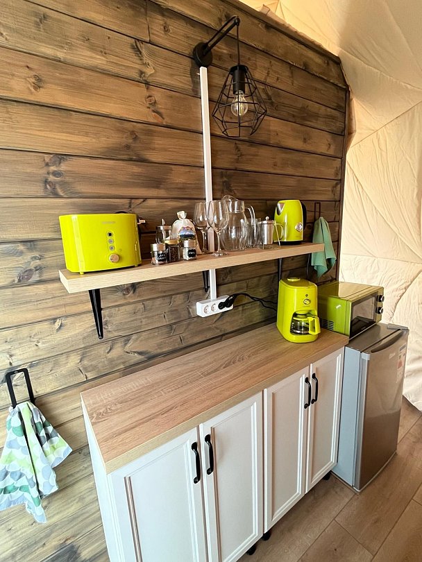 В зоне кухни плиты нет, это не безопасно для купола. Подумайте пожалуйста заранее о еде, магазин ближайший есть в с.Ташелка.