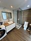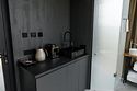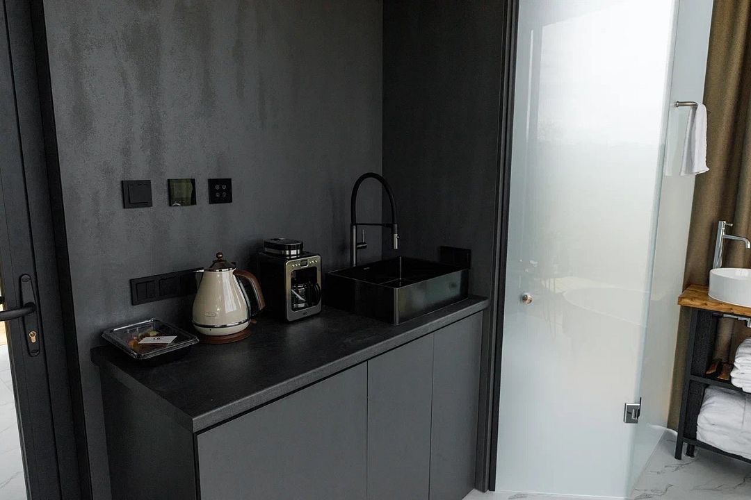 Внутри стильная гостиничная планировка: спальня с кроватью 160×200, мини-гардеробная, полноценный санузел с душевой, кресло-кровать с зоной для чтения (или в качестве дополнительного спального места), кухня, кондиционер.