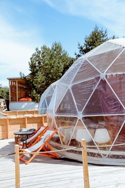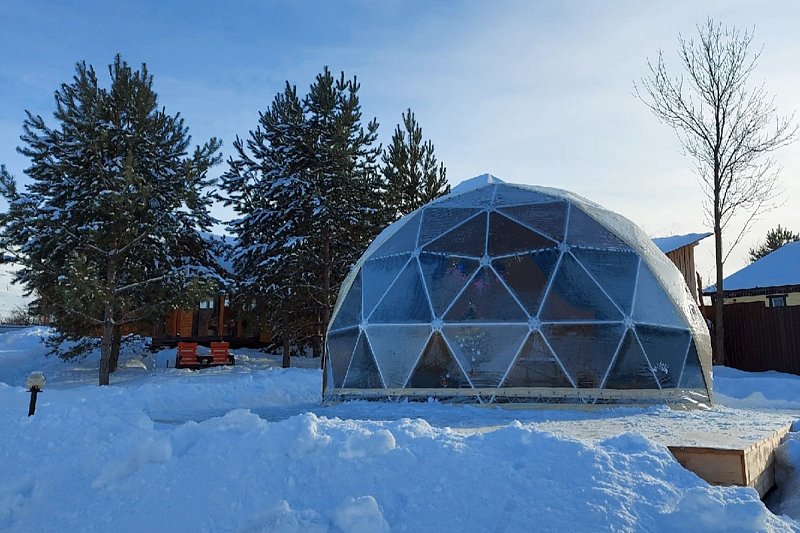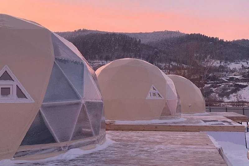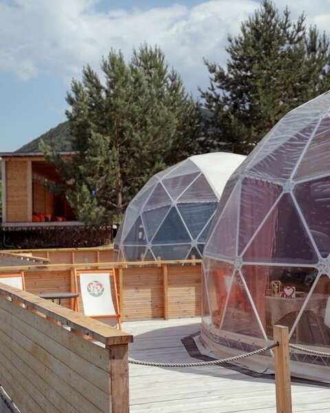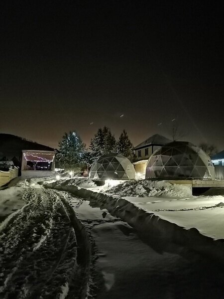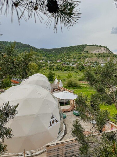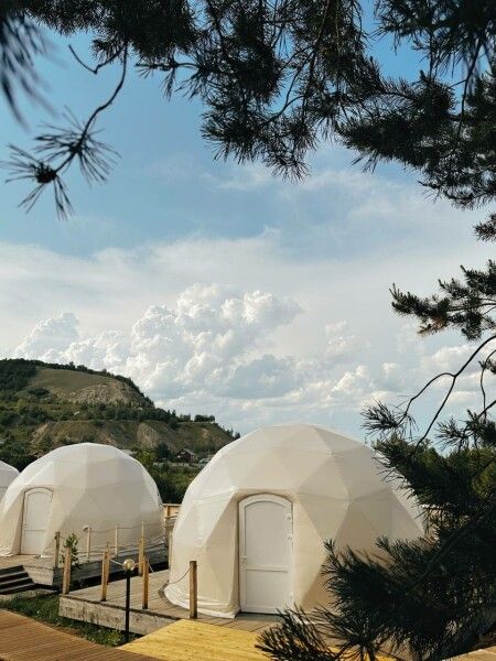 Площадь купола — 28 м², терраса — 20 м². Размещение: два взрослых + два ребенка. Вид на гору и сосны, панорамные окна, панорамная терраса. На территории оборудованы детские площадки с качелями.