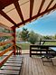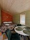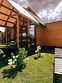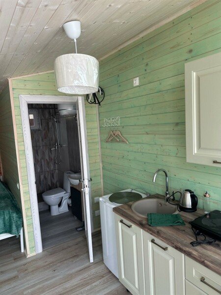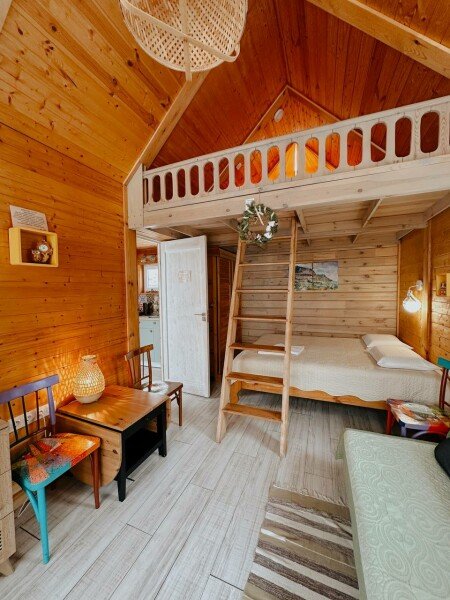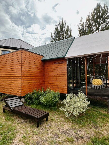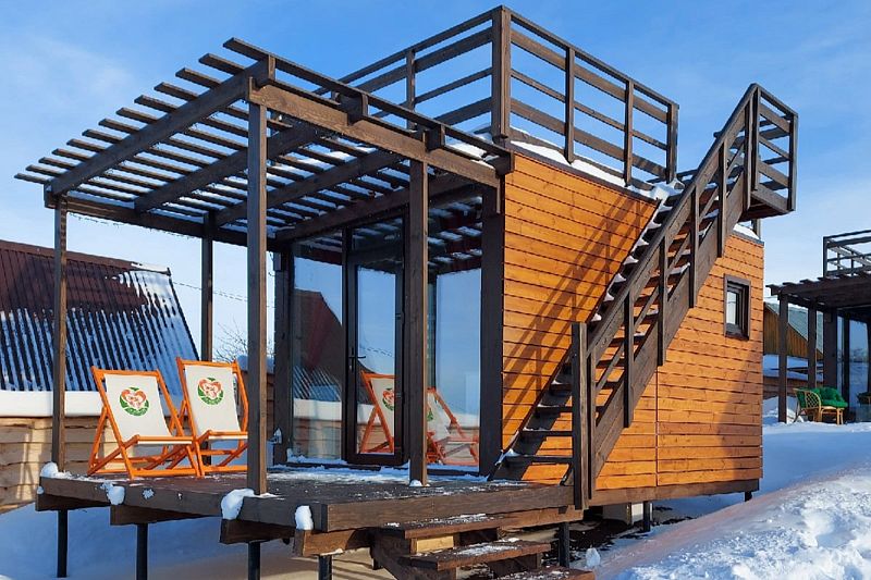 Домик с отдельным входом подходит для пары или небольшой семьи. Площадь домика — 14 м², терраса — 6 м². Размещение: два взрослых + один ребенок. На территории оборудованы детские площадки с качелями.