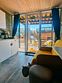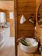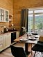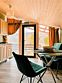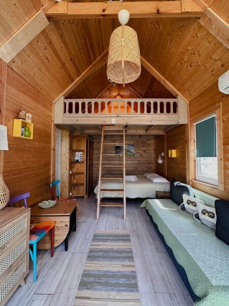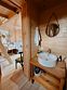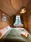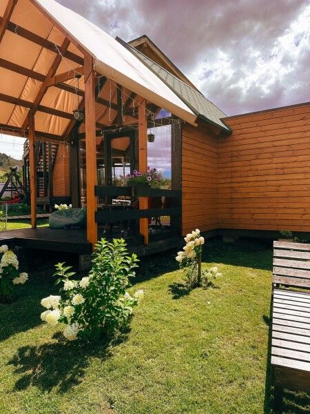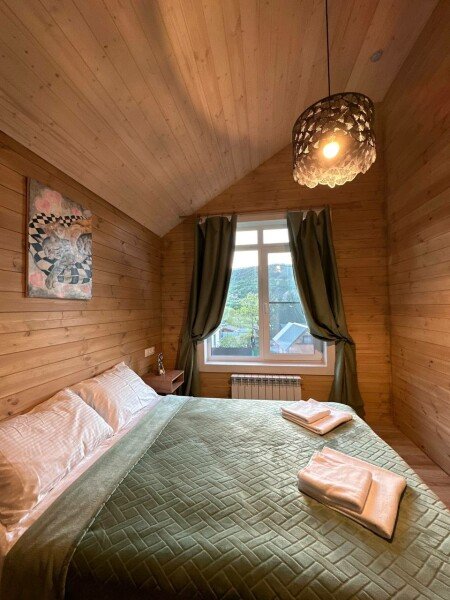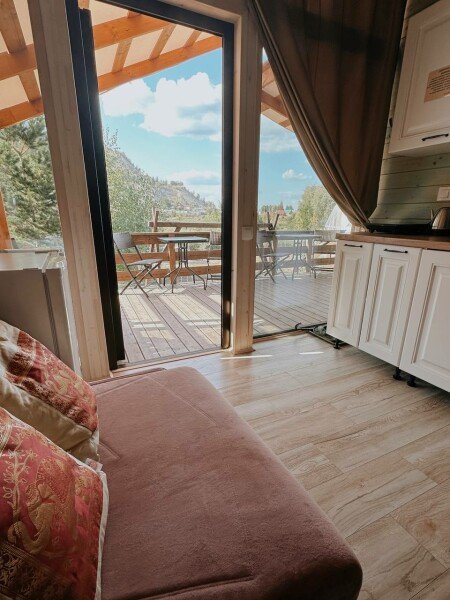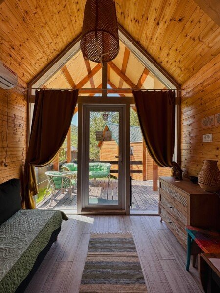В домике: панорамные окна, вид на горы, панорамная терраса; одна двуспальная кровать; раскладное кресло-кровать; кондиционер; санузел и душ, водонагреватель; шампунь, кондиционер для волос и гель для душа.