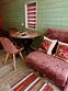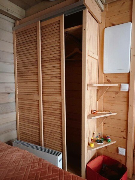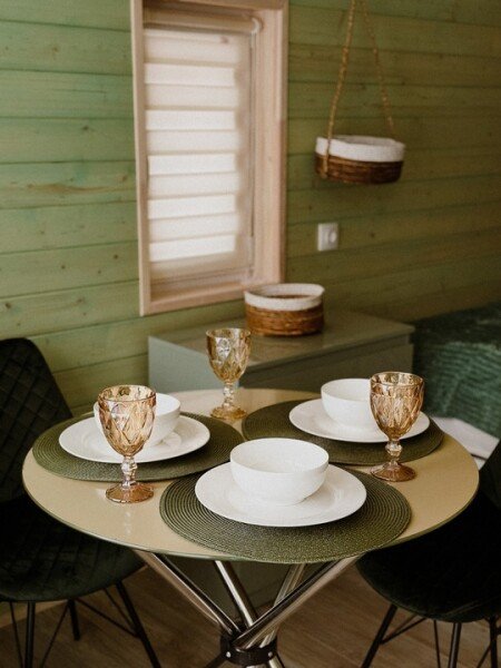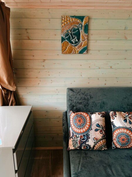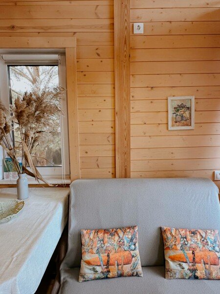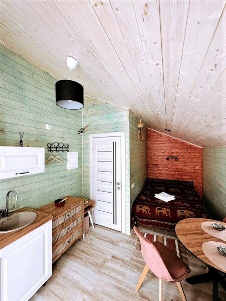 В доме компактный раскладной стол, комфортный матрас, дизайнерские детали интерьера создают уют; обогрев пола.