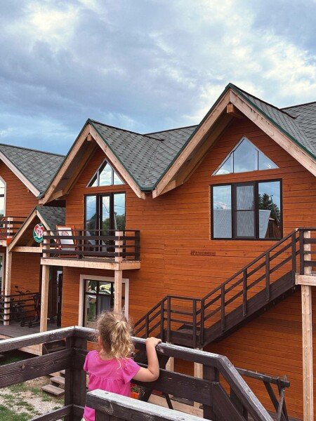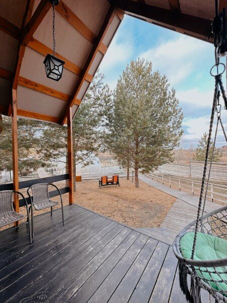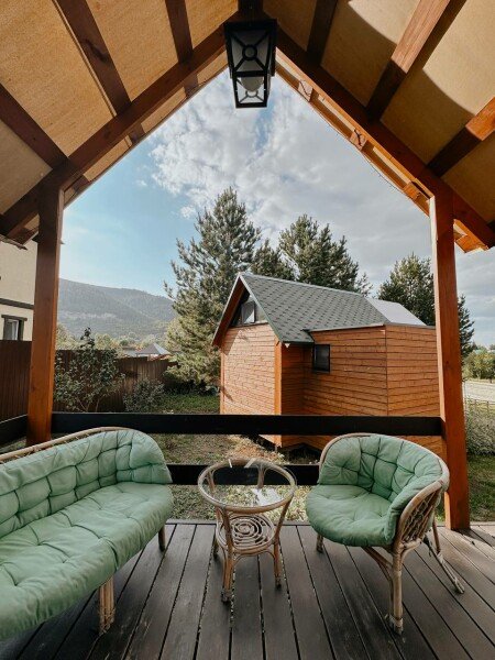 Площадь домика — 18 м², терраса — 6 м². Размещение: два взрослых + два ребенка, дополнительное место на диване. Вид на гору и сосны, панорамная терраса. На территории оборудованы детские площадки с качелями.