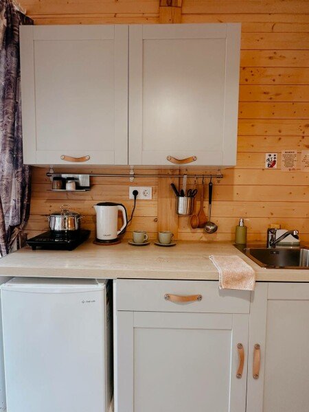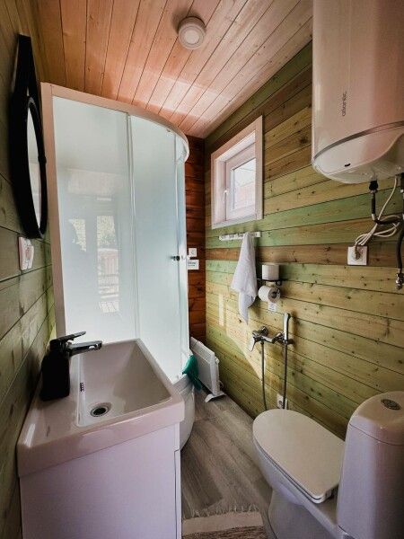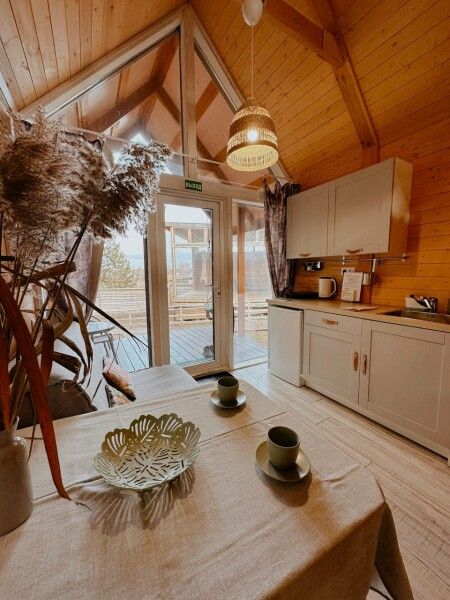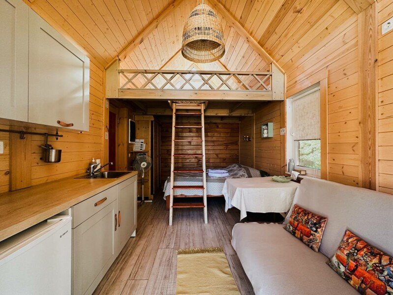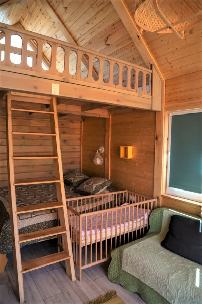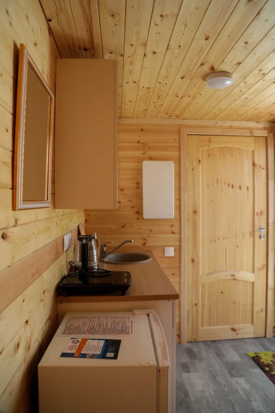В домике: мини-кухня: чайник, плита, небольшой холодильник, посуда, откидной столик; двуспальная кровать; двуспальное место на мансардном этаже; ортопедические матрасы, дизайнерские детали интерьера, создающие уют; раскладной диван; постельное белье, полотенца; санузел и душ, водонагреватель; шампунь, кондиционер для волос и гель для душа; обогрев пола.