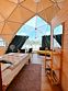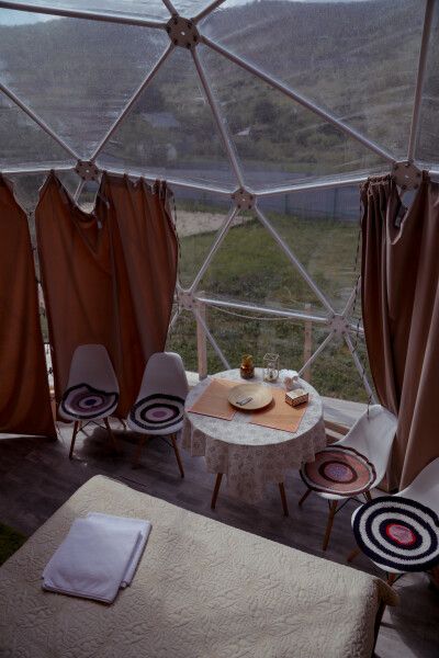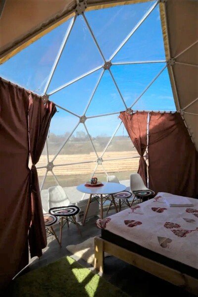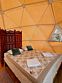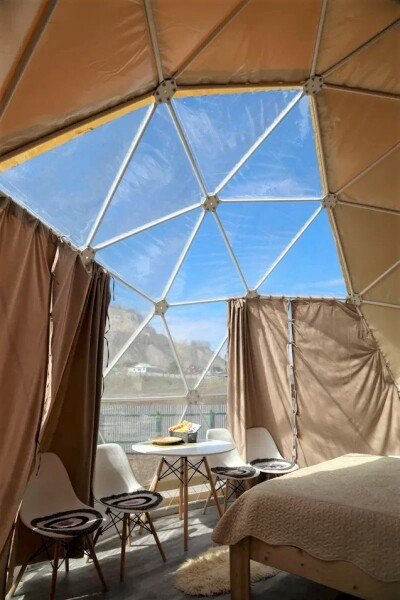 В куполе: кондиционер; мини-кухня: чайник, плита, небольшой холодильник, посуда, столик; двуспальная кровать (имеется возможность разделения ее на две односпальные); ортопедические матрасы, дизайнерские детали интерьера, создающие уют; раскладной двуспальный диван; постельное белье, полотенца; санузел и душ, водонагреватель; шампунь, кондиционер для волос и гель для душа; обогрев пола.