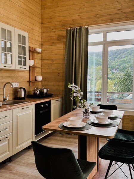 Оборудованная кухня: холодильник, плита, чайник, посуда для сервировки и приготовления пищи; постельное белье, полотенца; ортопедические матрасы, дизайнерские детали интерьера, создающие уют.
