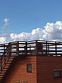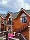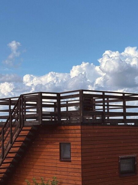 Площадь домика — 14 м², нижняя терраса — 6 м², верхняя терраса — 14 м². Размещение: два взрослых + один ребенок. Панорамные окна, панорамная терраса на крыше и перед домом. На территории оборудованы детские площадки с качелями.