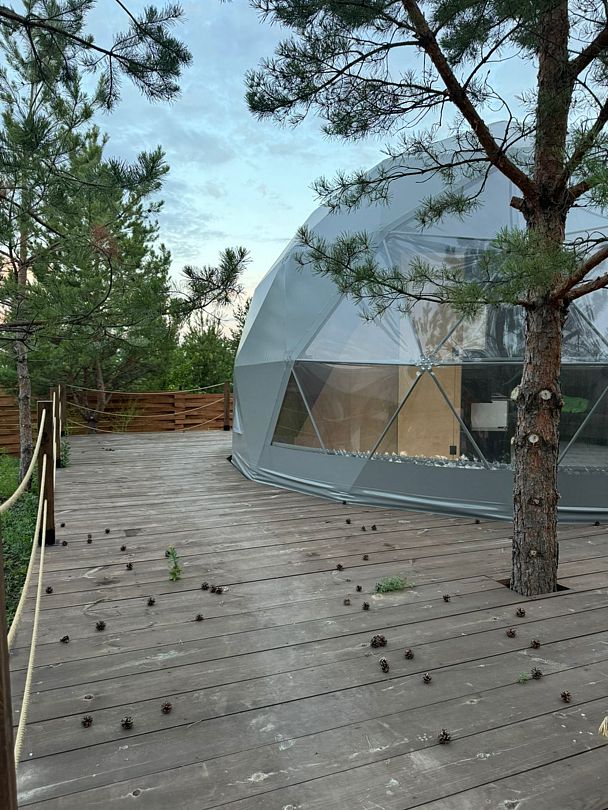 🌲В Рамено (15 минут езды от центра Сызрани в лесу рядом в пяти минутах езды от благоустроенного пруда) пять уютных круглогодичных геокуполов на 4-5 человек, оборудованных всем для комфортного отдыха: кухня с мини-холодильником, микроволновкой, столовой посудой, чайником, стол со стульями на 4 человека, ванна с феном, гелем для душа, шампунем, мылом, Wi-Fi, водонагреватель, кондиционер, двуспальный раскладной диван, двуспальное место на антресоли, постельное белье, полотенца. При необходимости возможно доставить детскую кроватку-манеж.