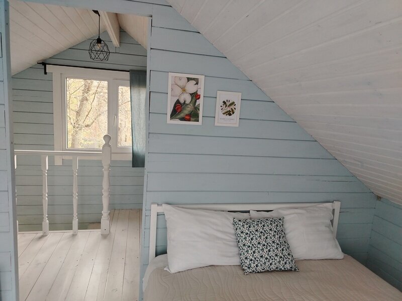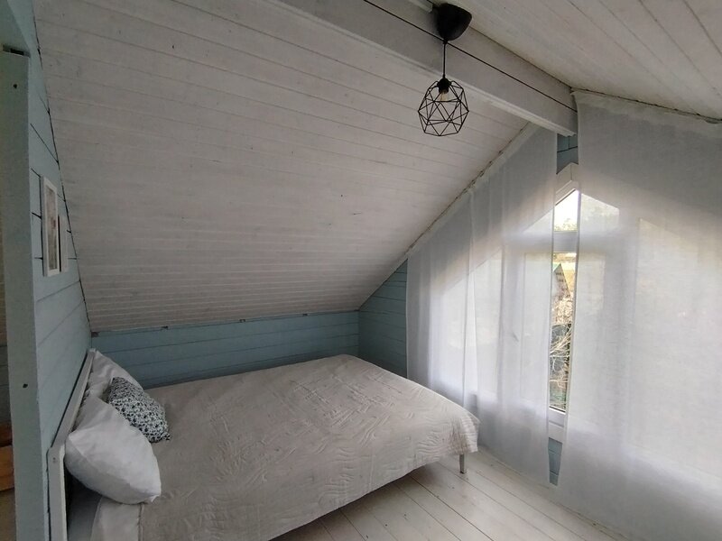 Двухэтажный дом с просторной верандой и панорамным окном, 50 м, расположенный на краю соснового леса. Комфортно разместятся до 4 взрослых. Баня входит в стоимость аренды.