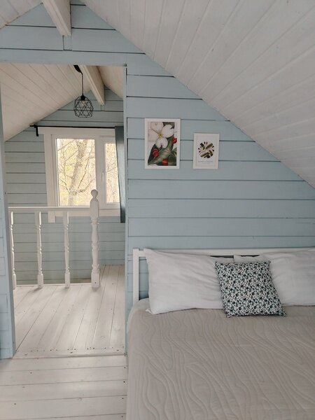 «Голубой домик в Озёрном» — это тёплый двухэтажный дом с просторной верандой и панорамным окном, в котором смогут комфортно разместиться четверо взрослых.