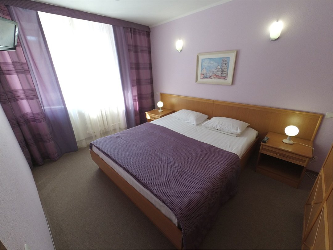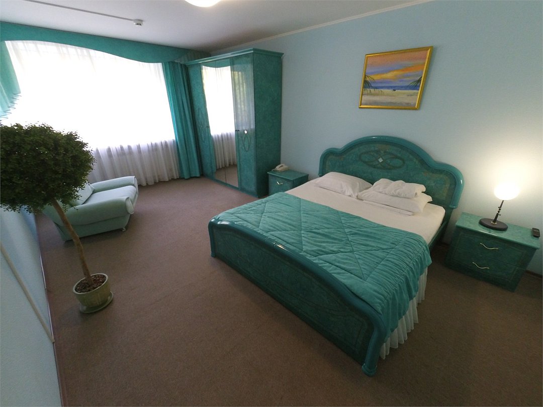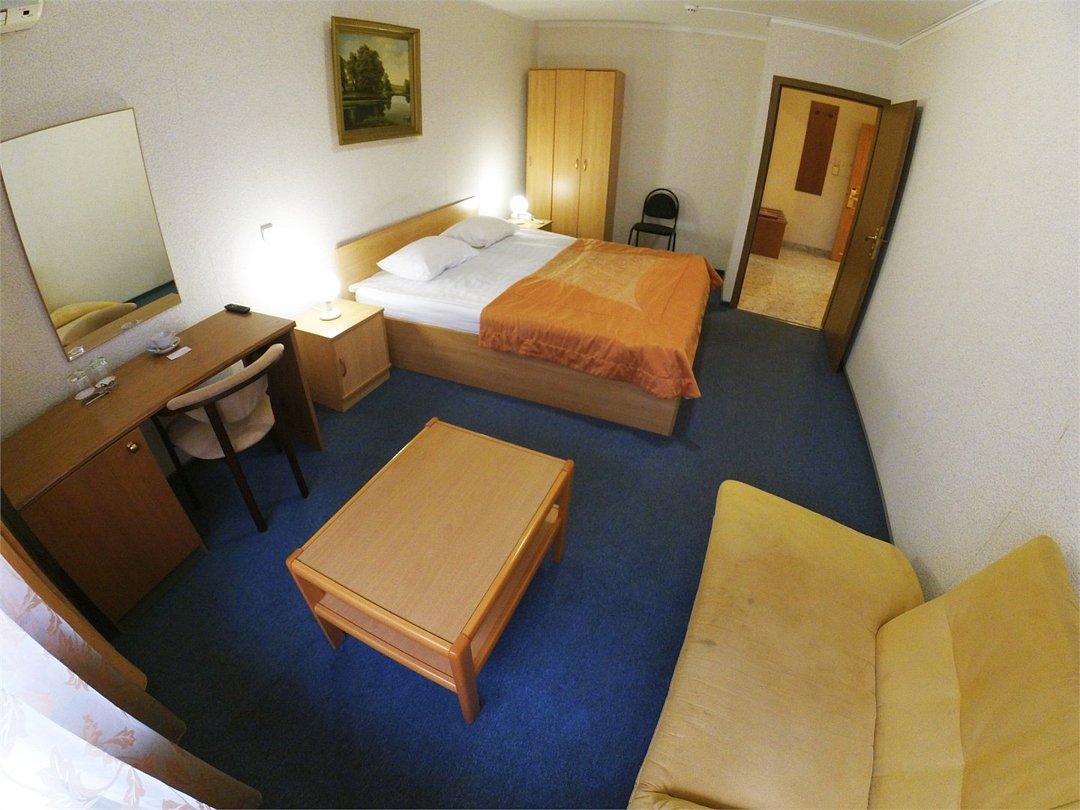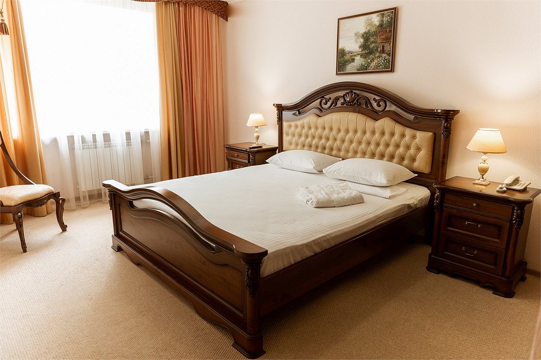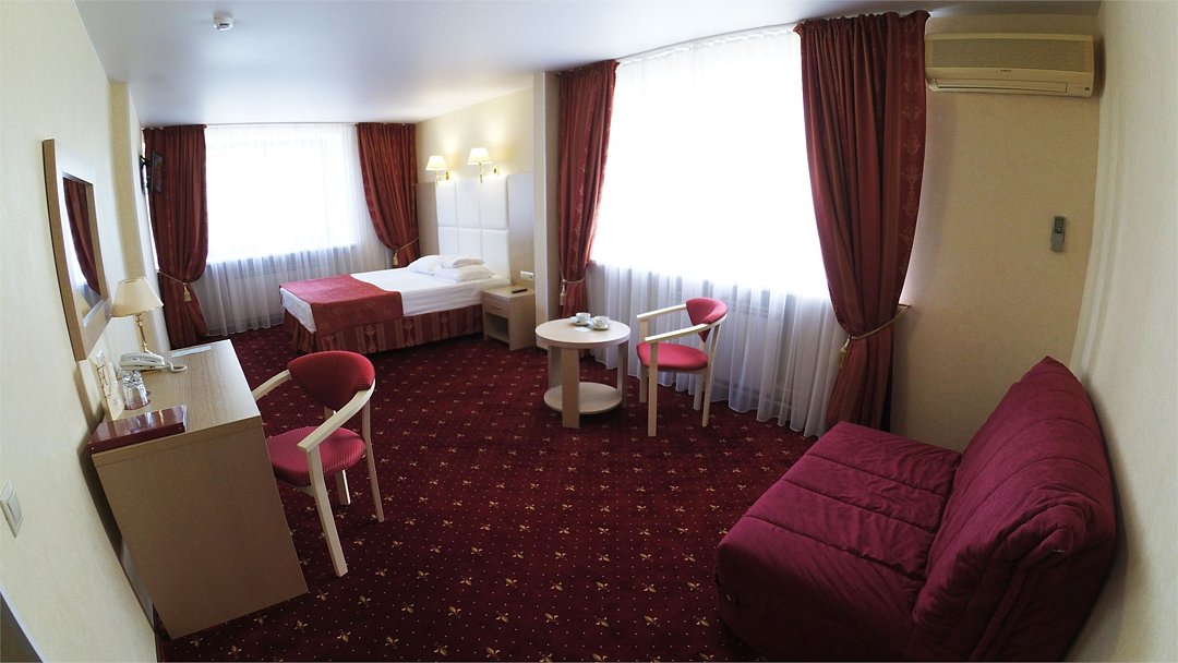 Комфортабельный номер, площадью 45 кв.м., двуспальная кровать, в некоторых номерах - зона с мягкой мебелью, телевизор, кондиционер, холодильник, телефон, сейф, Wi-Fi.Услуги и удобства