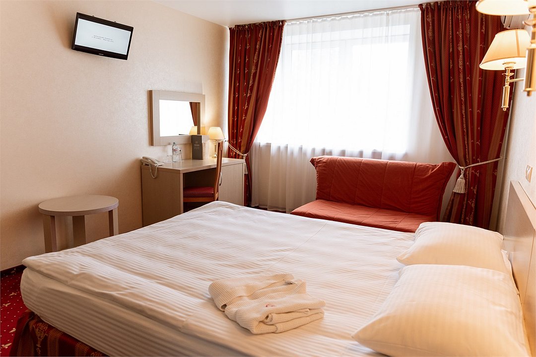 Комфортный однокомнатный номер площадью 37-45 кв.м. Оформлен в новом фирменном стиле сети AMAKS Hotels&Resorts. Размещение в номере до 4 чел. Дополнительное место раскладной диван. Просторный номер, разделенный на рабочую зону и зону отдыха. В номере двуспальная кровать (180*200), диван, шкаф-купе, письменный стол, ЖК телевизор, кондиционер, телефон, мини-бар (за дополнительную плату), Wi-Fi. Санузел с душевой кабиной, фен, халат, тапочки, туалетные принадлежности.Услуги и удобства