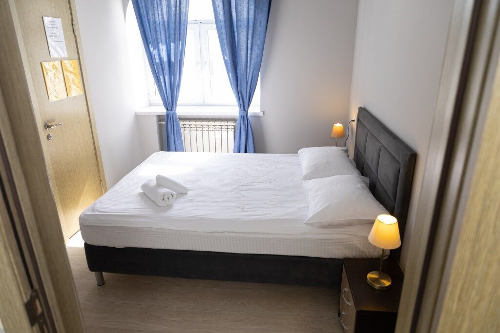 Кровать в общем номере с видом на город