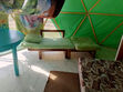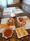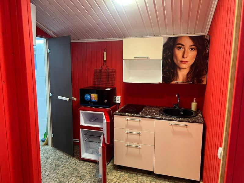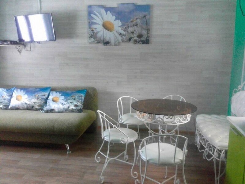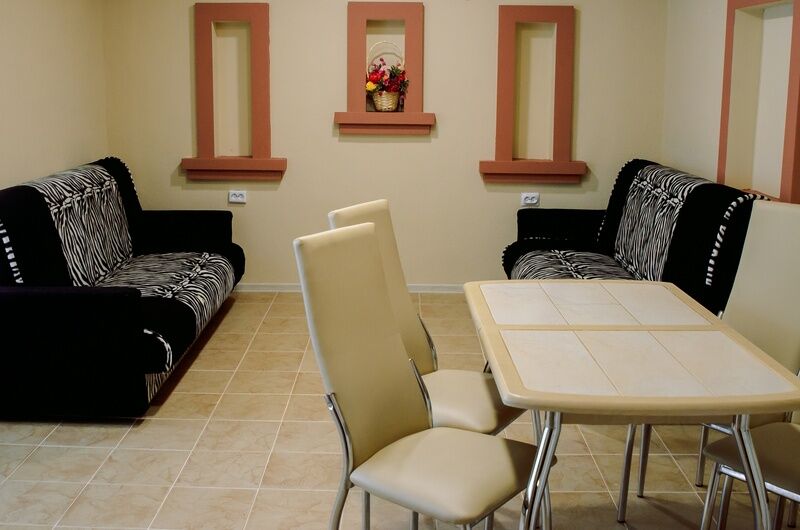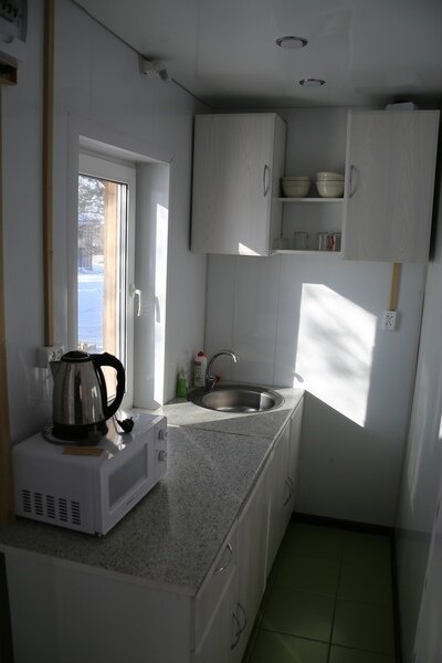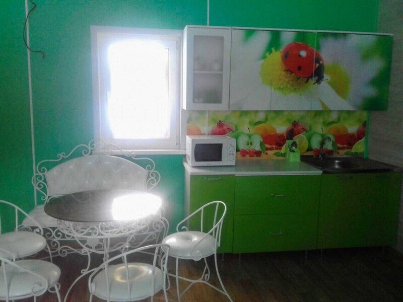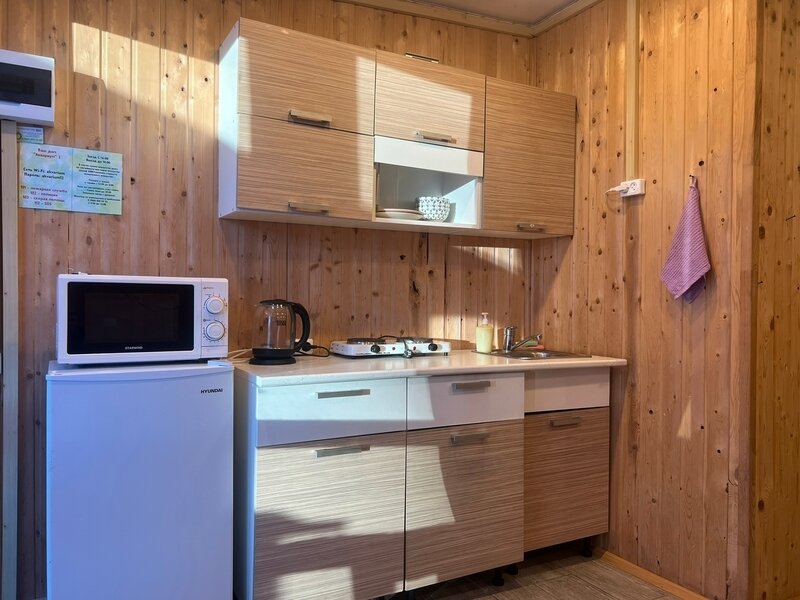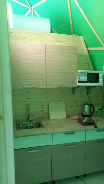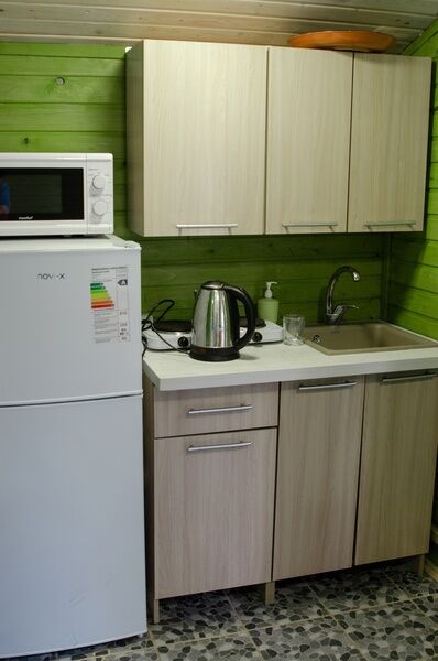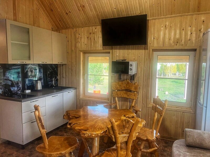 В каждом доме маленькая кухонька (с раковиной и теплой водой), телевизор, холодильник, чайник, микроволновка. Постельное белье, посуда, полотенца. Во дворе мангал.
