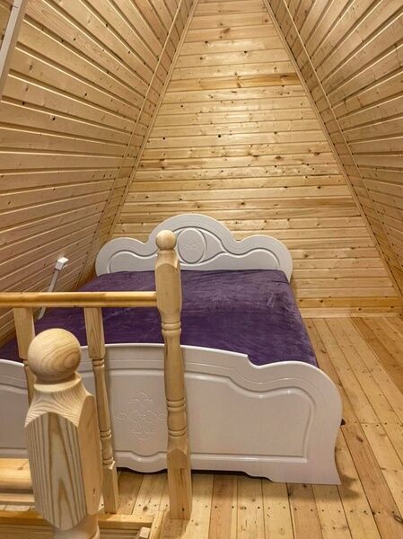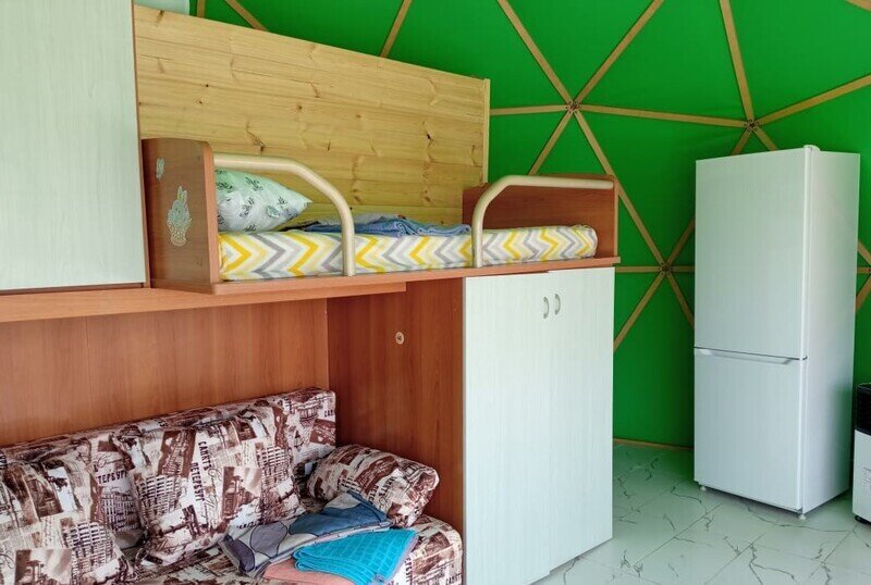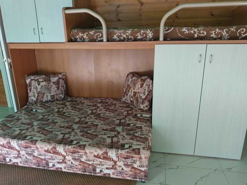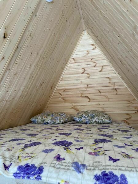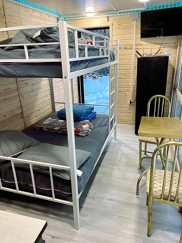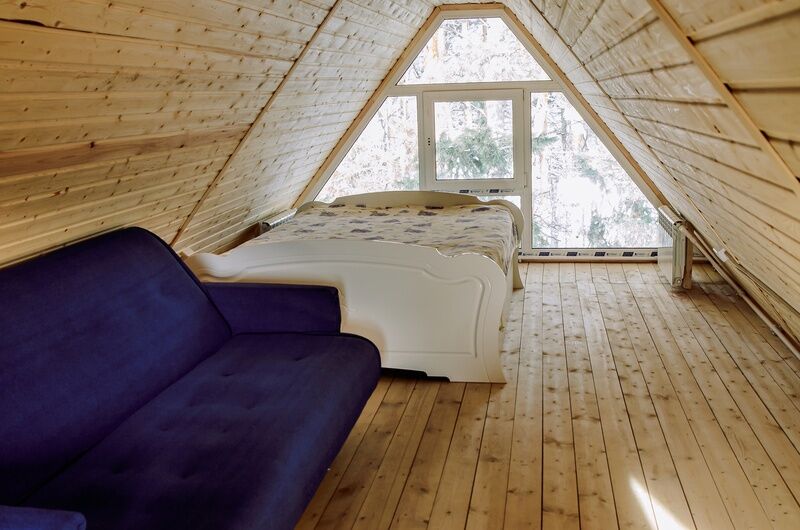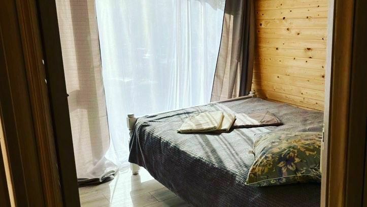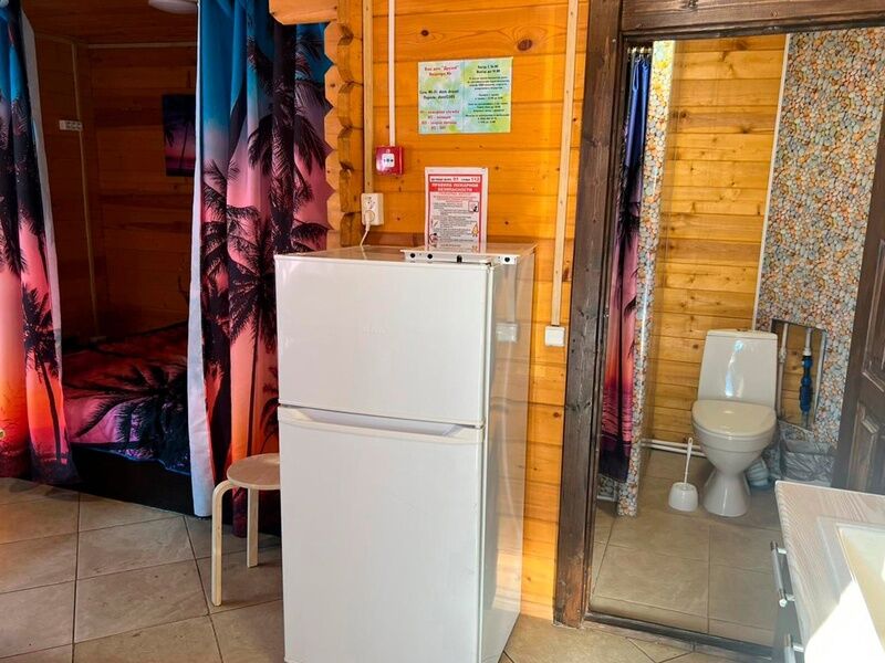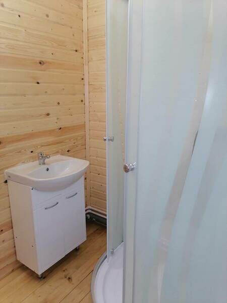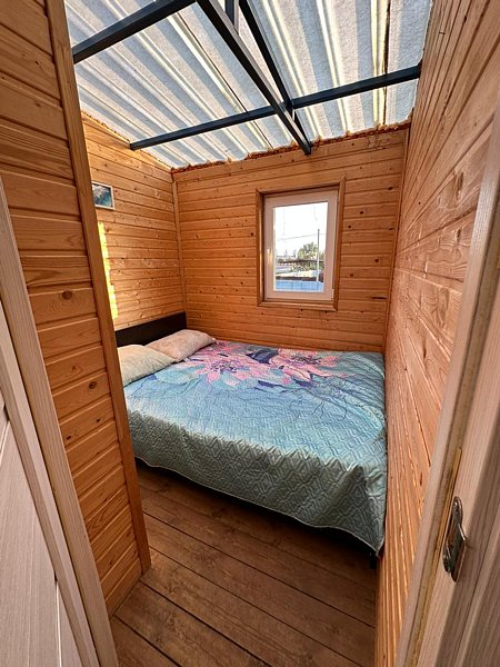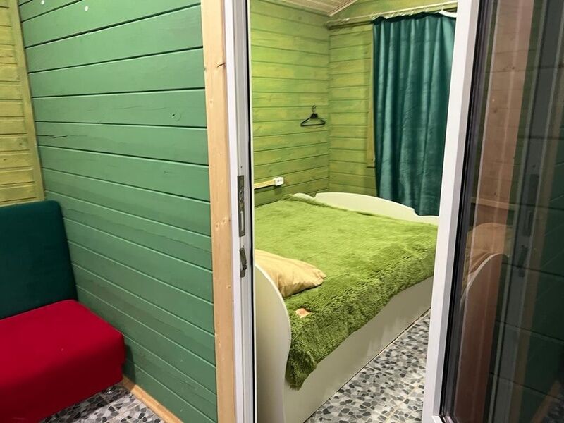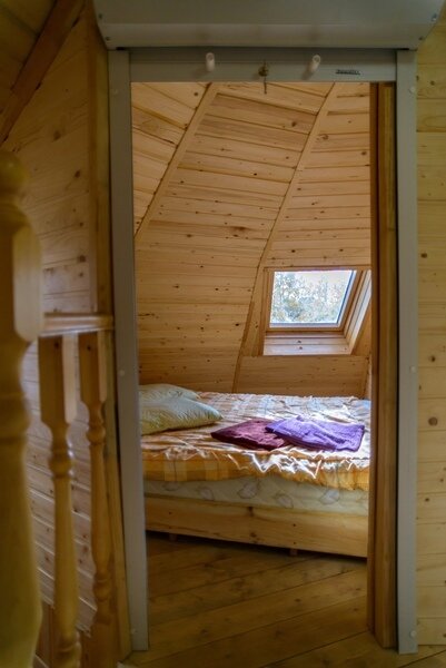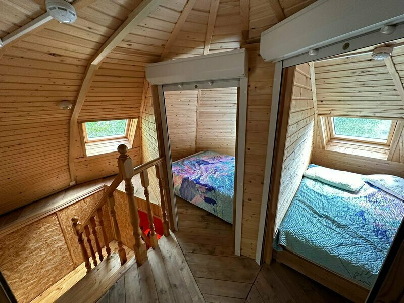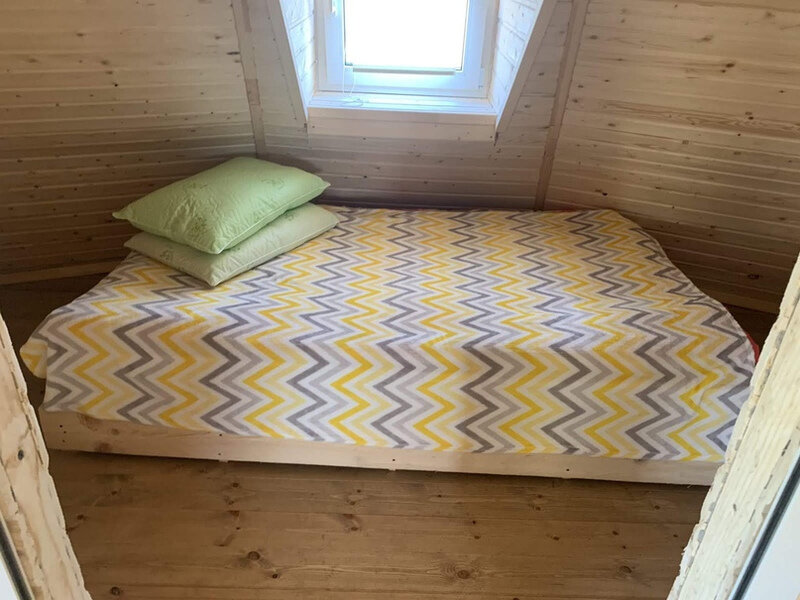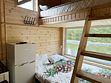 Каждый домик имеет санузел (унитаз и раковина), спальное место на двоих и 1 детское спальное (антресоль) место.