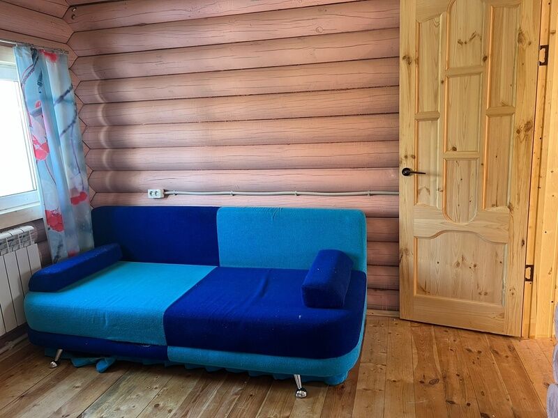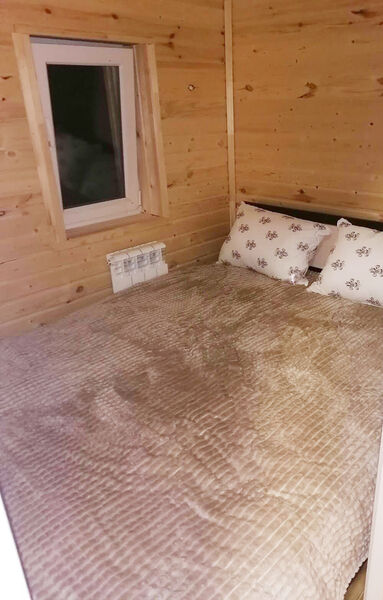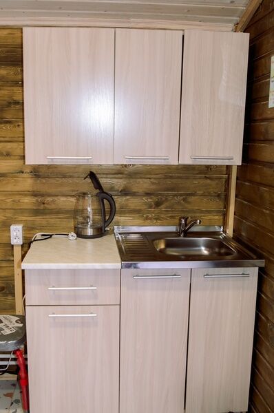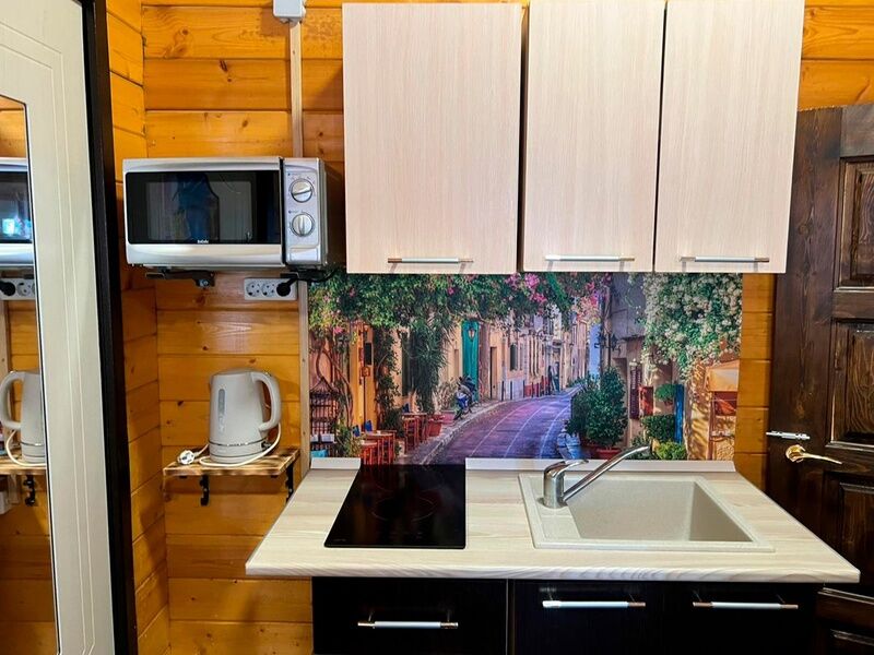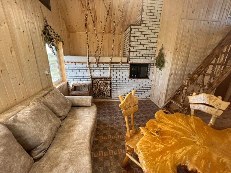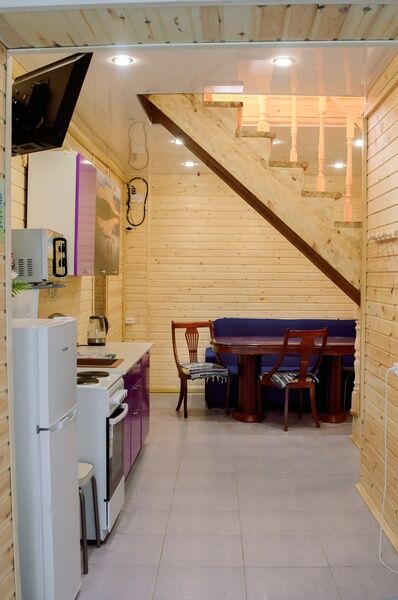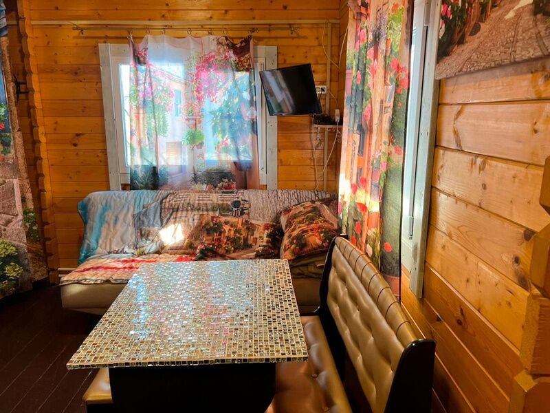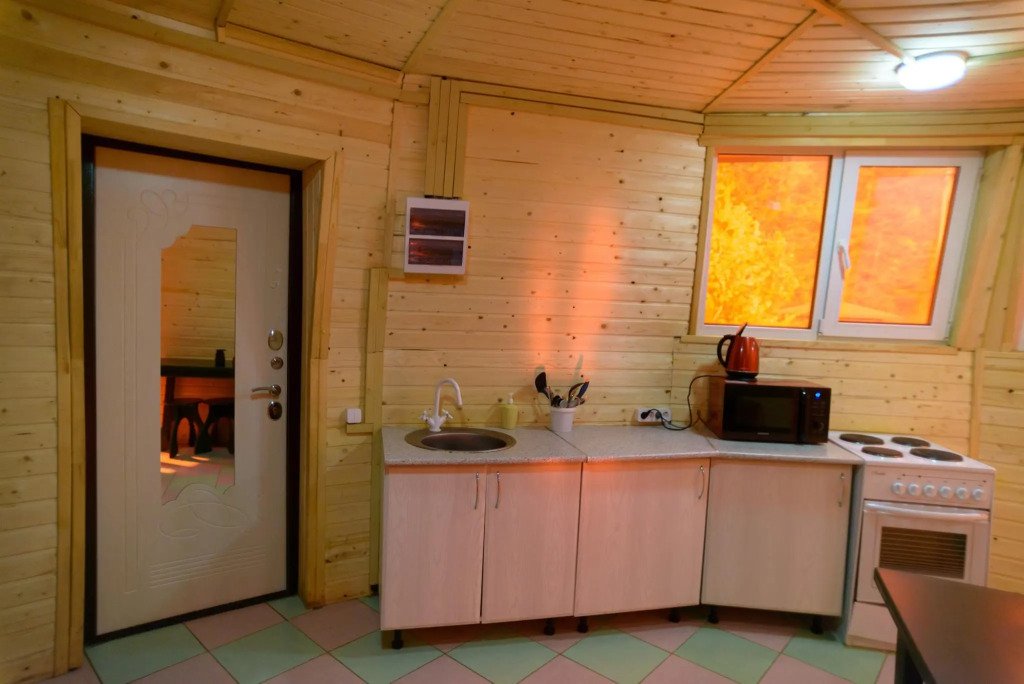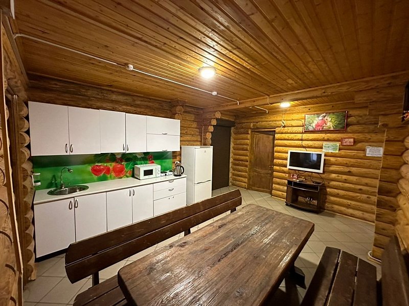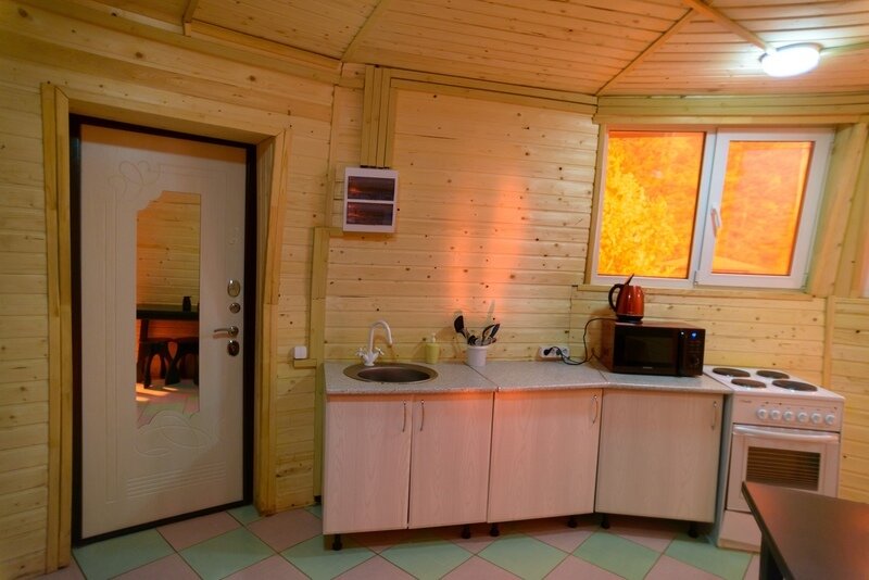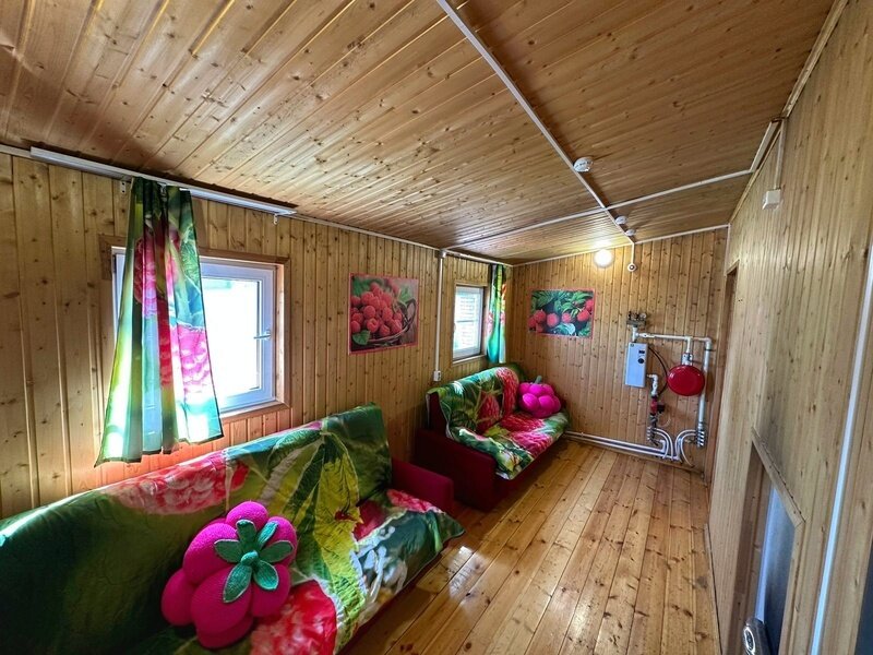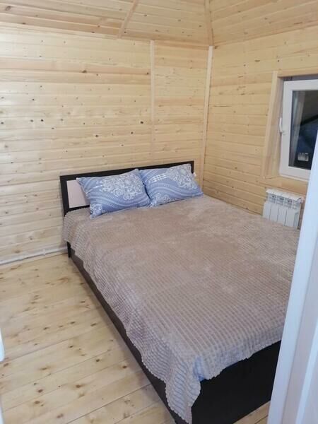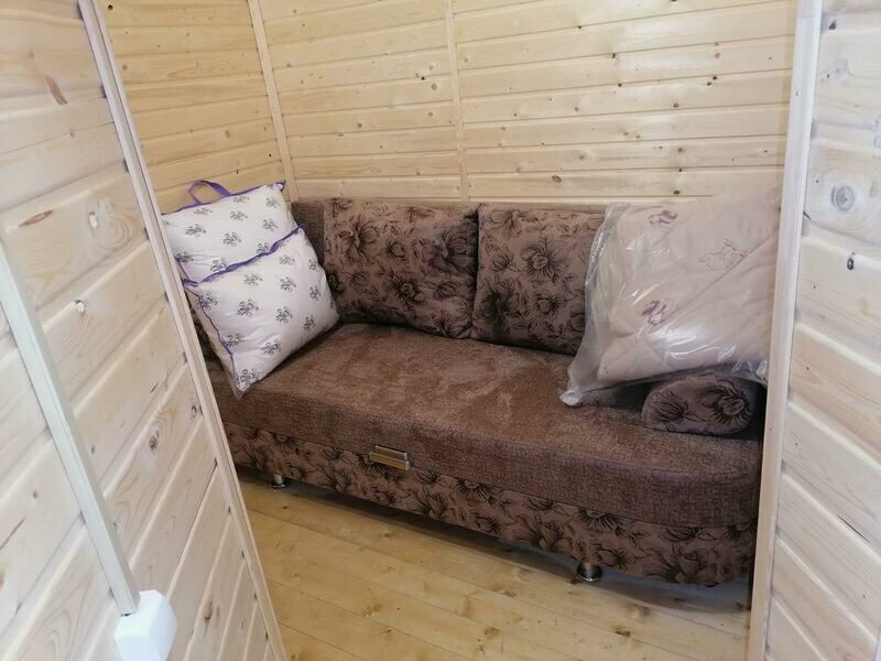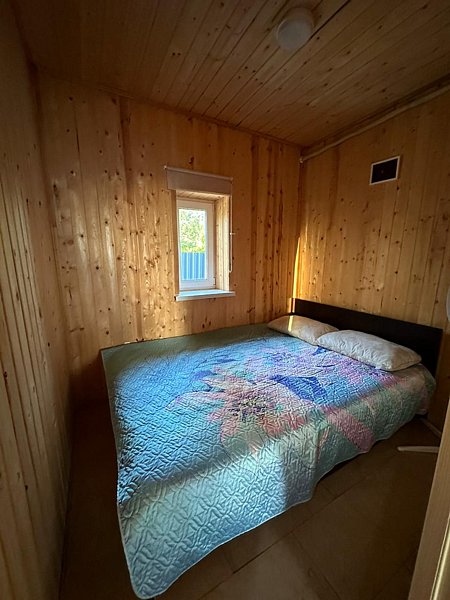В доме санузел, кухня, комната с двуспальным диванов и вместительная русская баня. Домик рассчитан на 2 спальных места. В нем есть: телевизор, холодильник, чайник, плита, мультиварка. Посуда, сковороды, кастрюли, белье, мангал.