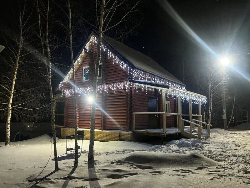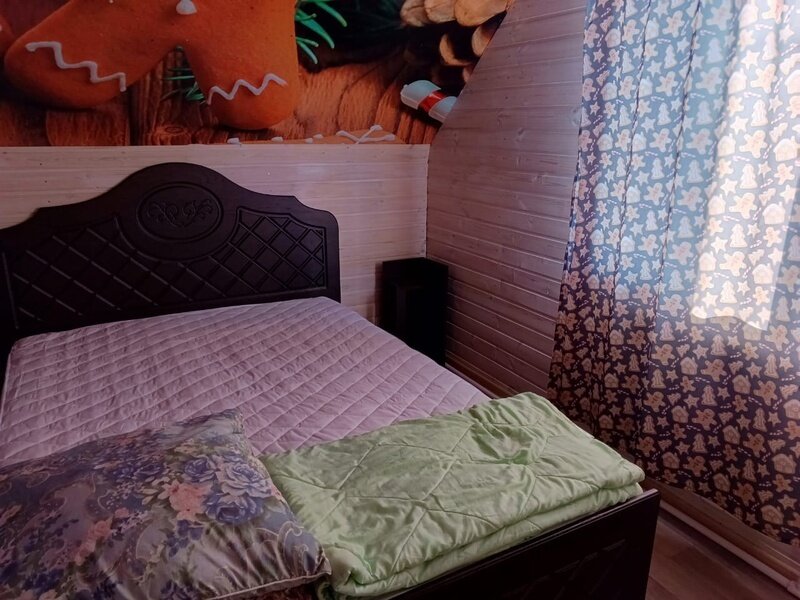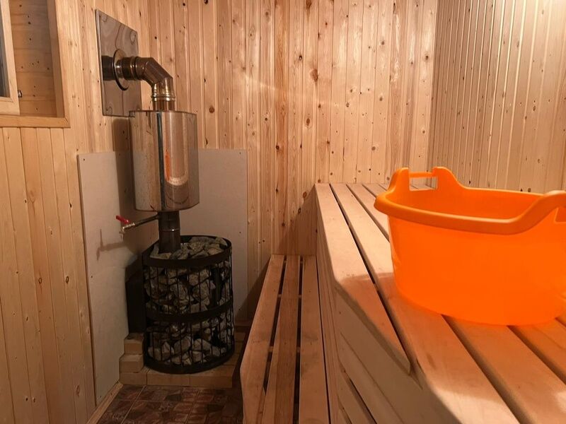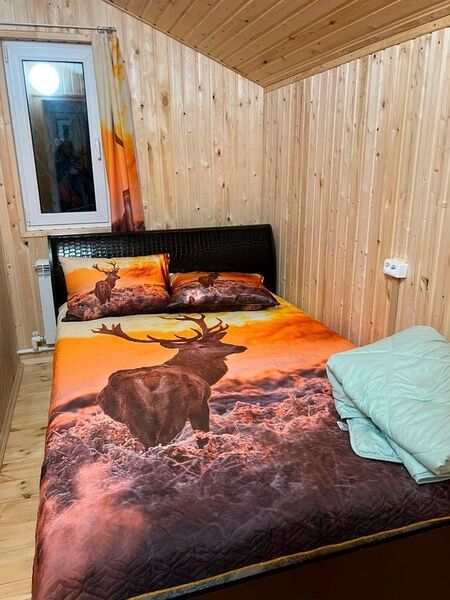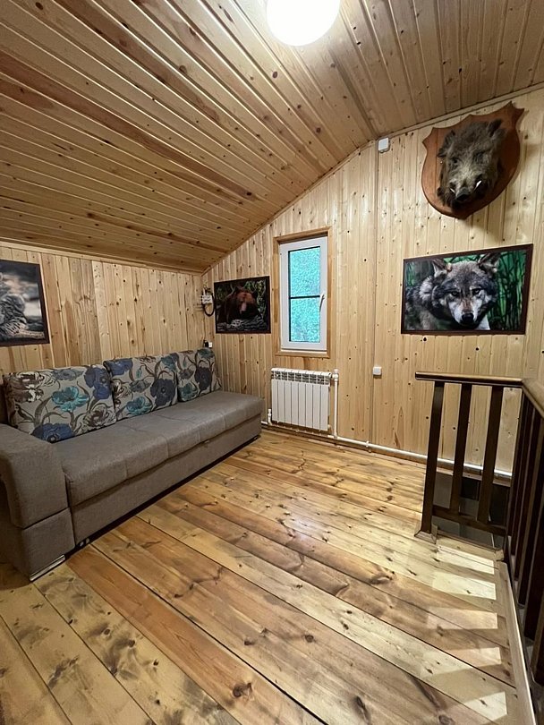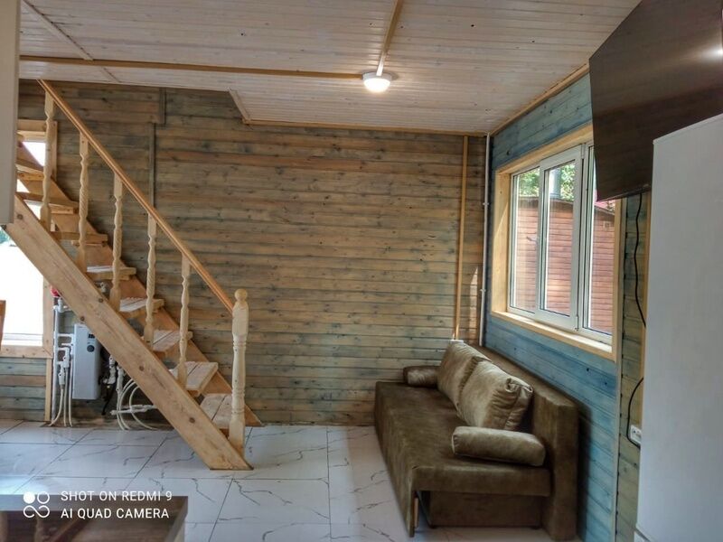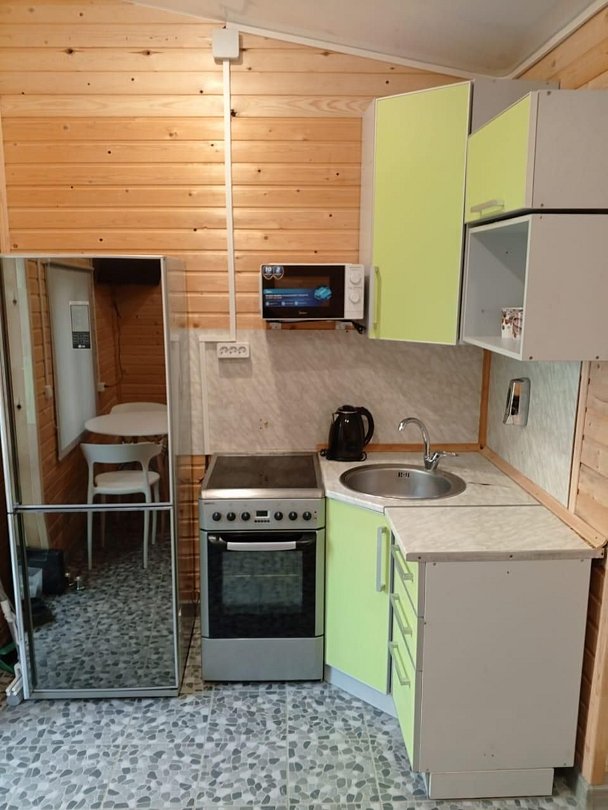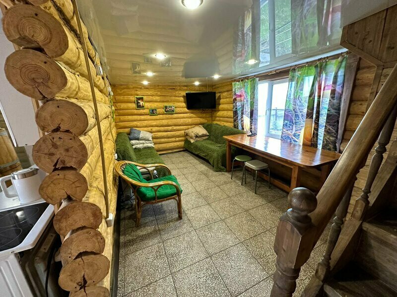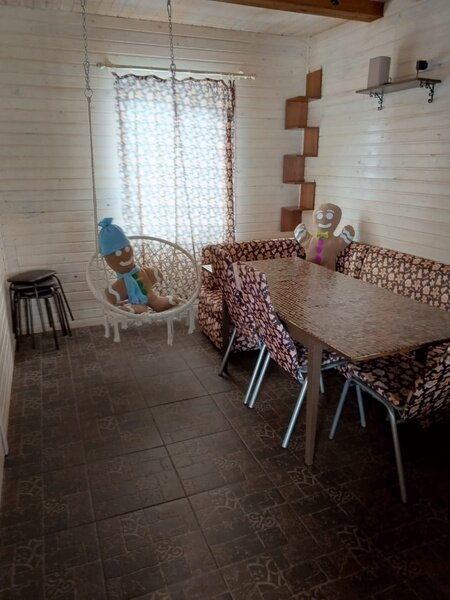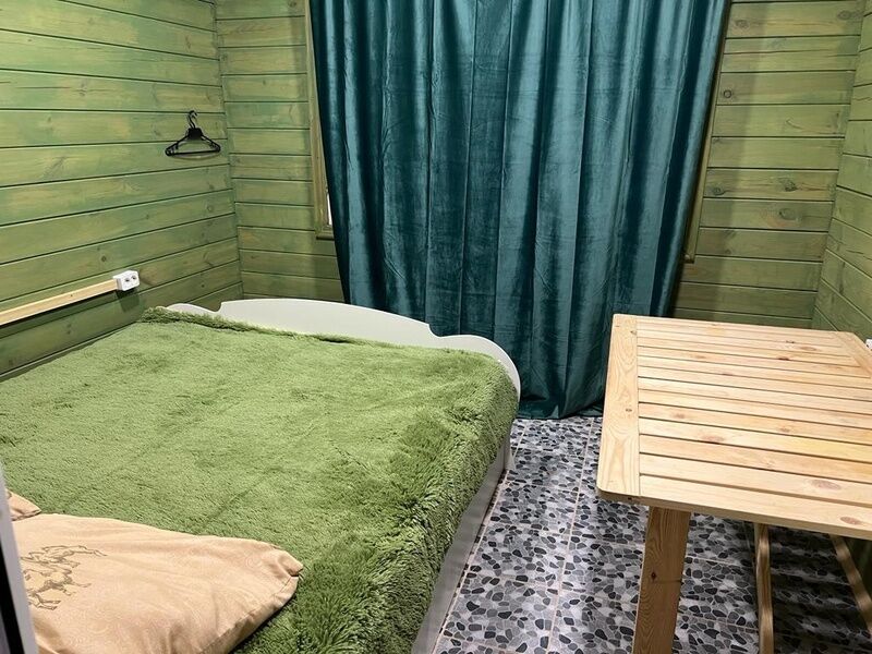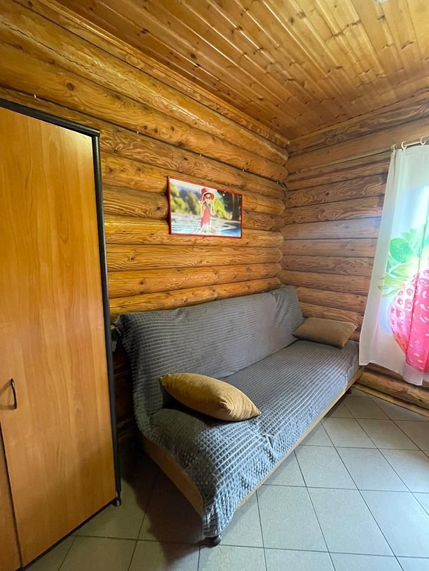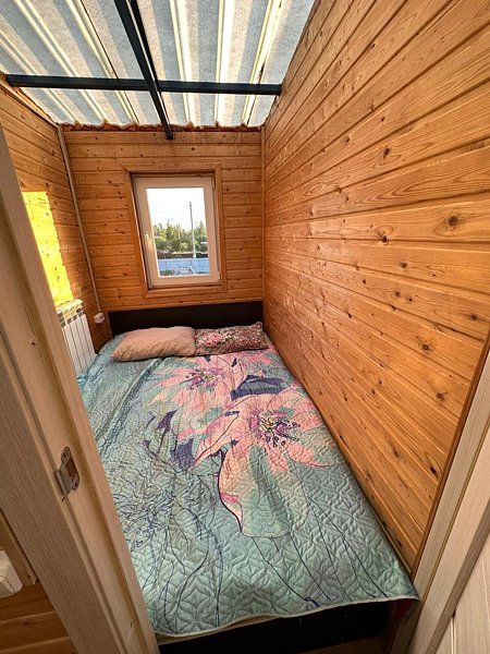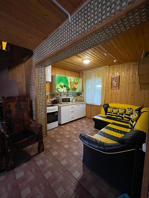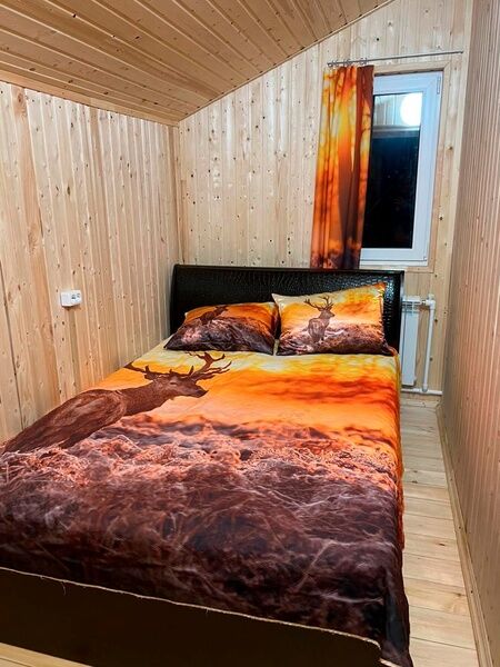 В доме санузел, кухня, комната с двуспальным диванов и вместительная русская баня. Домик рассчитан на 2 спальных места. В нем есть: телевизор, холодильник, чайник, плита, мультиварка. Посуда, сковороды, кастрюли, белье, мангал.