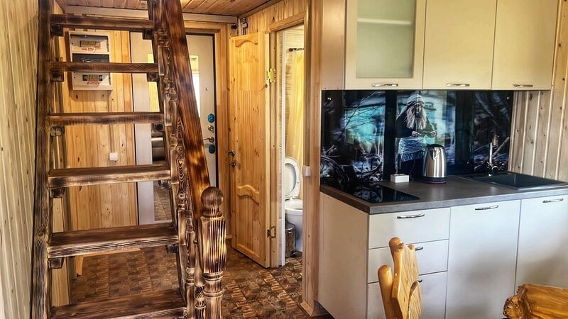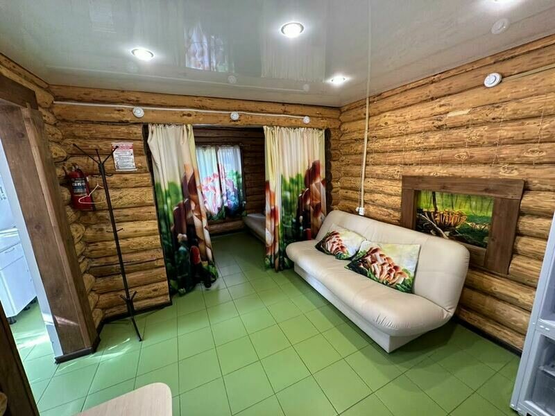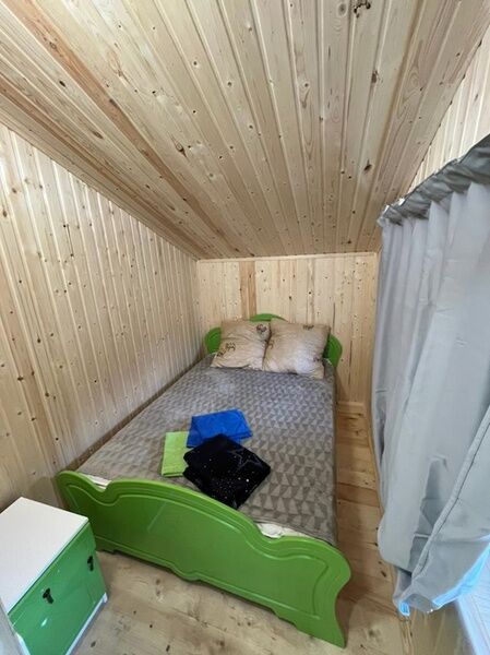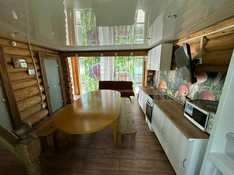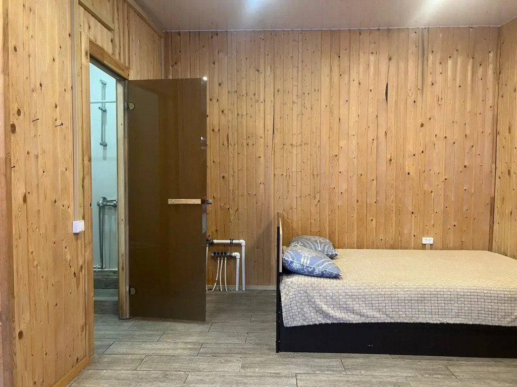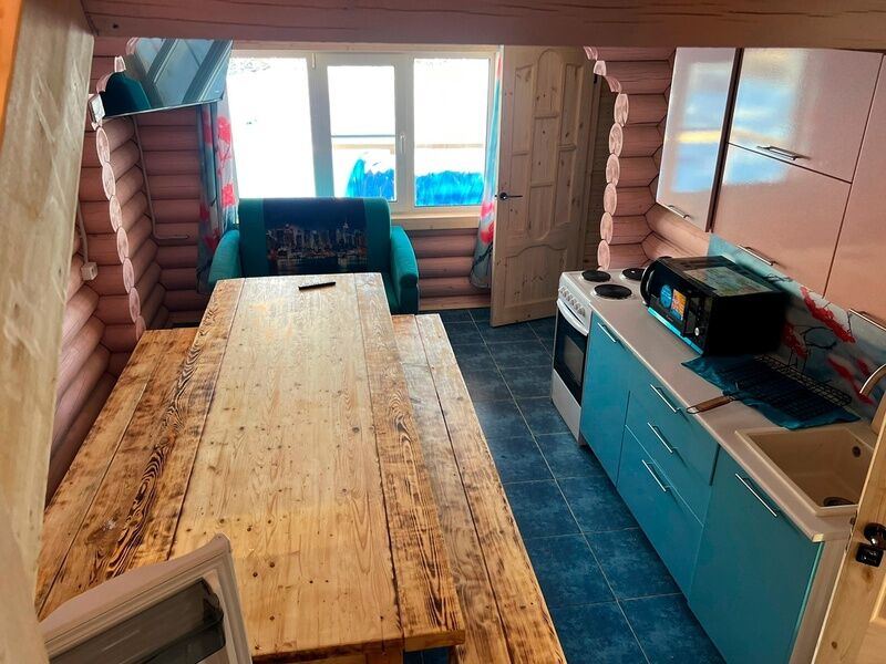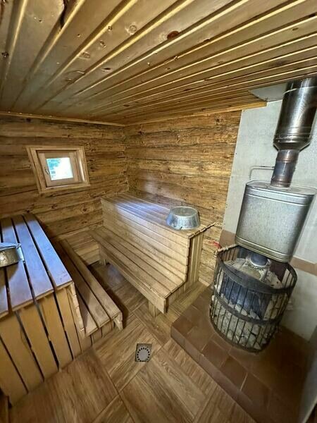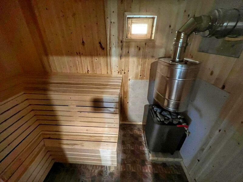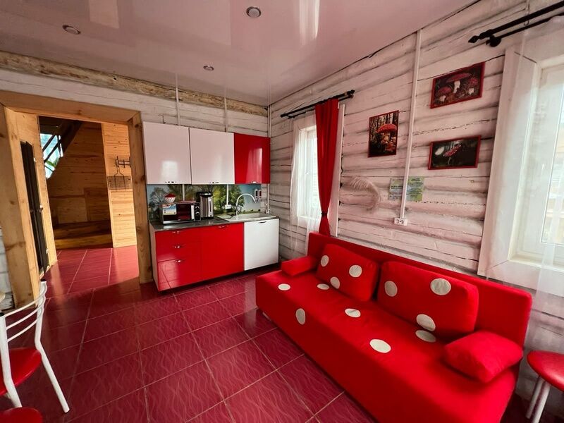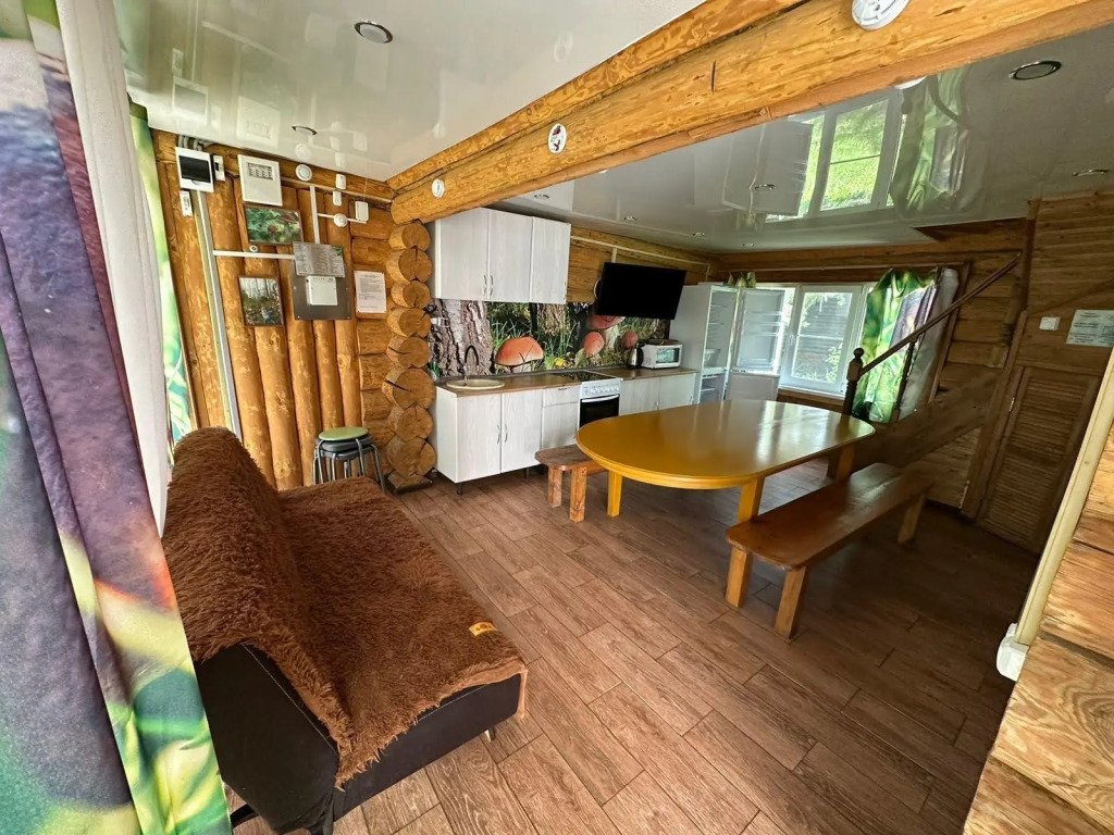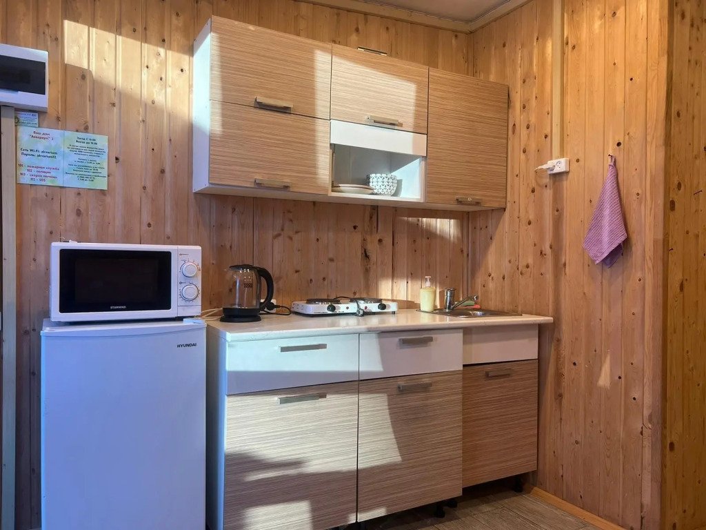 В доме санузел, кухня, комната с двуспальным диванов и вместительная русская баня. Домик рассчитан на 2 спальных места. В нем есть: телевизор, холодильник, чайник, плита, мультиварка. Посуда, сковороды, кастрюли, белье, мангал.