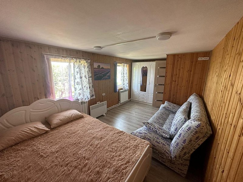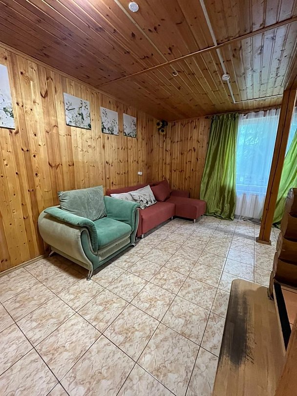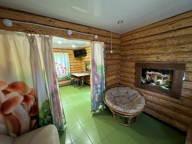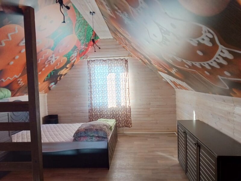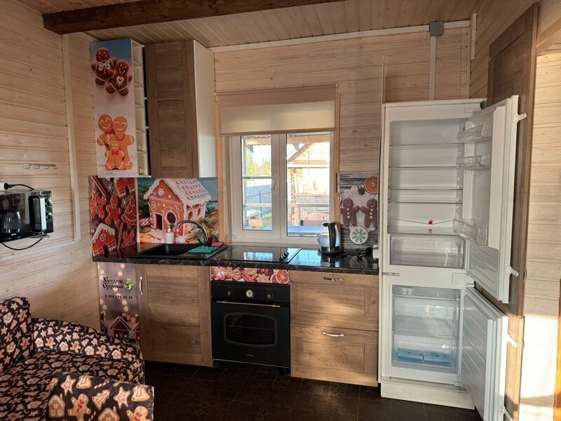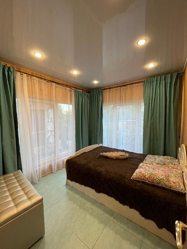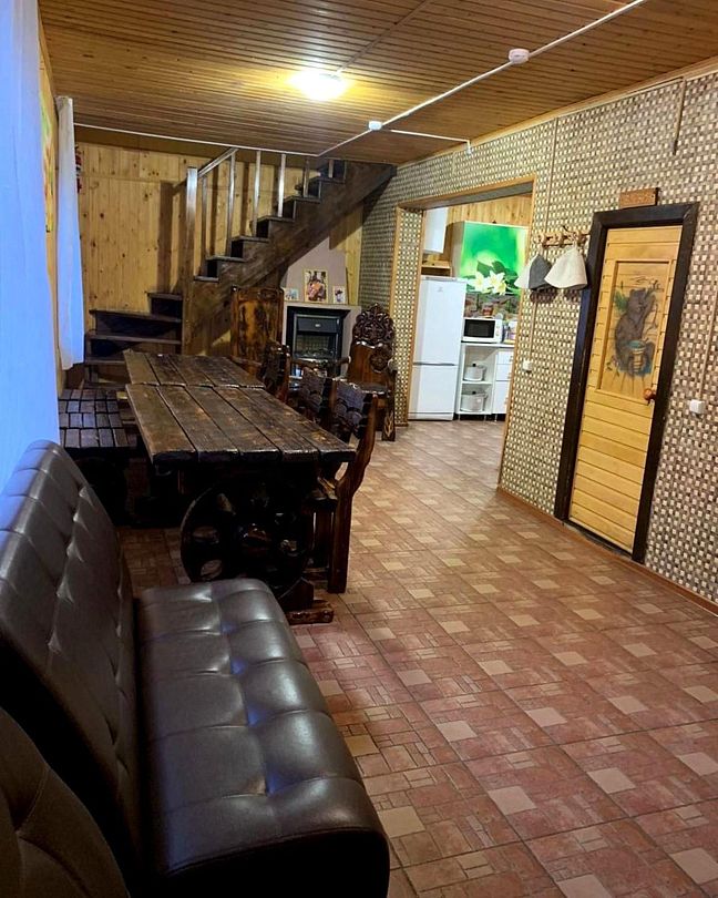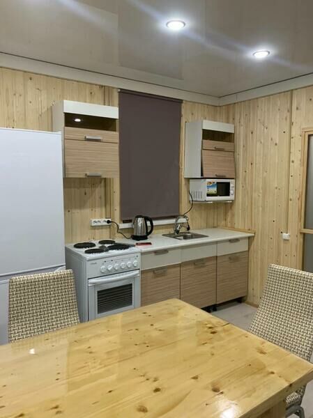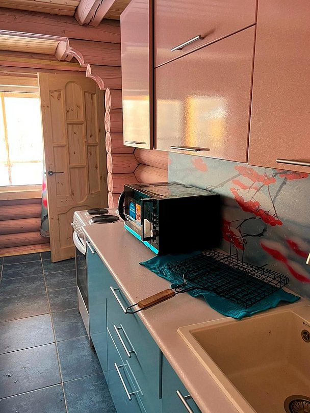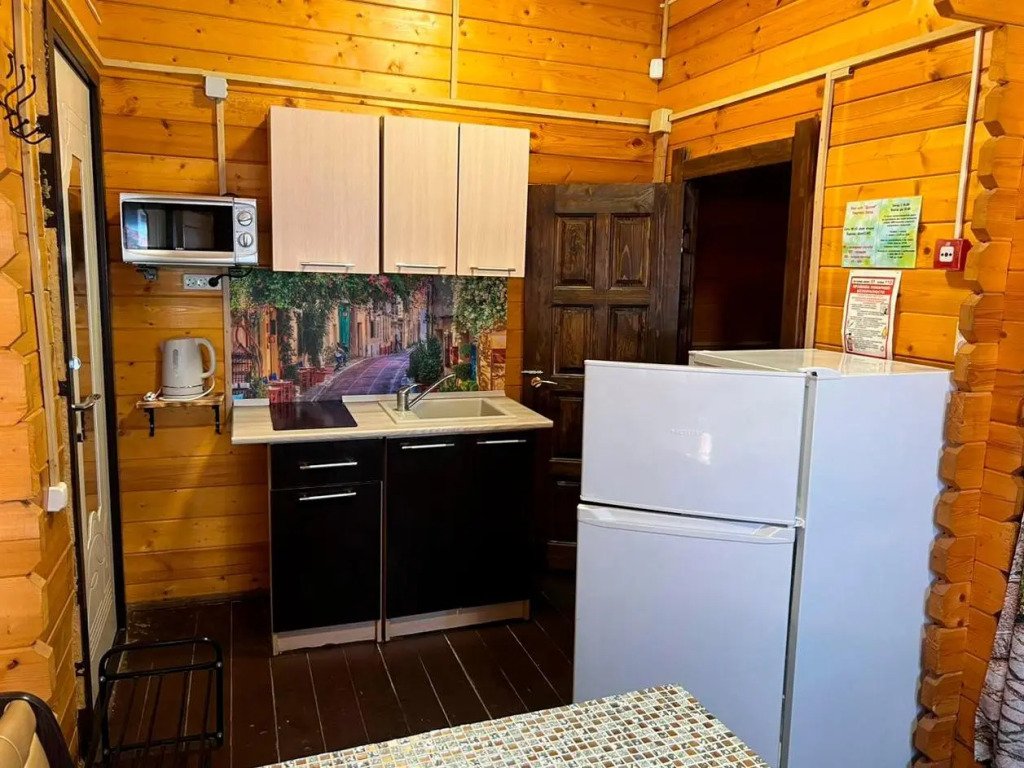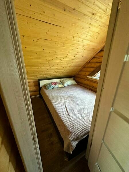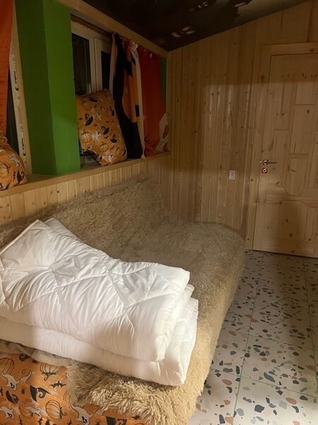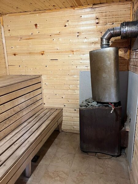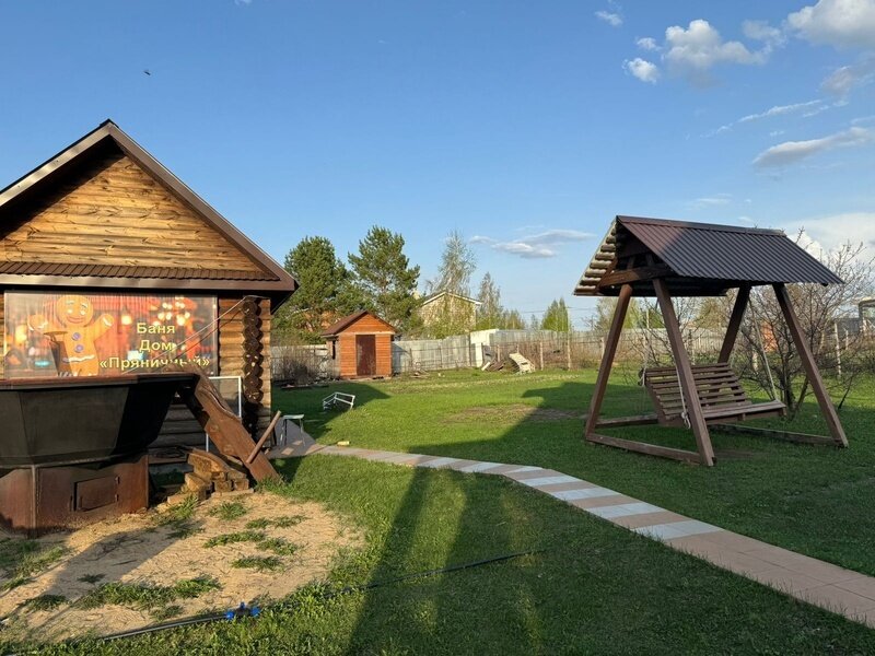 В доме санузел, кухня, комната с двуспальным диванов и вместительная русская баня. Домик рассчитан на 2 спальных места. В нем есть: телевизор, холодильник, чайник, плита, мультиварка. Посуда, сковороды, кастрюли, белье, мангал.
