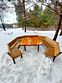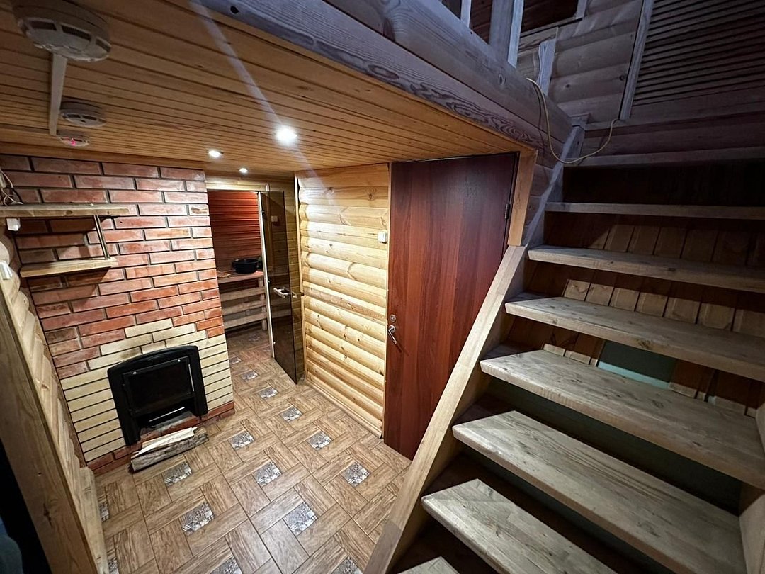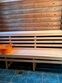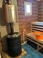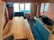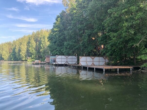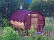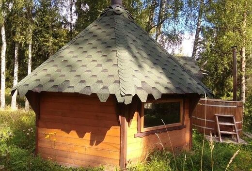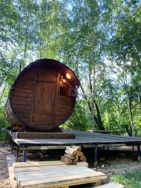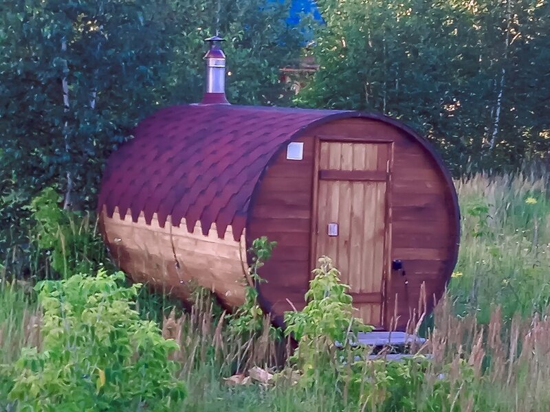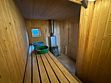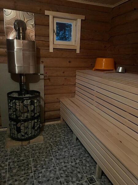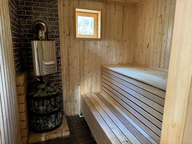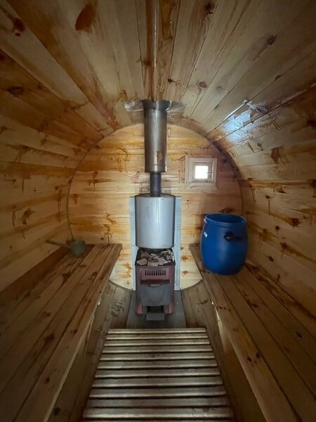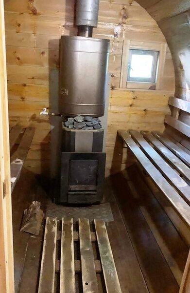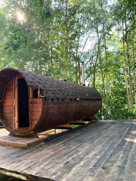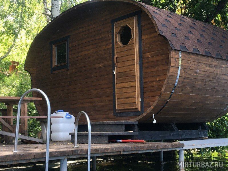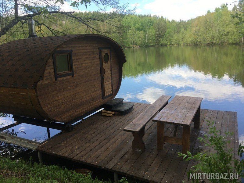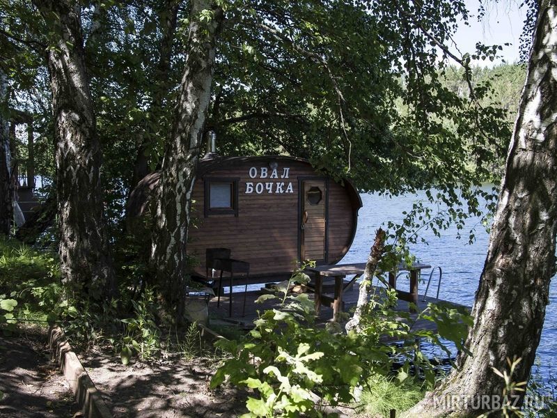 На пляже в 3 метров от озера. Красивая и горячая. 6 метров в длину до 10 человек. Рядом стол с лавками и мангал. Все что нужно для отдыха. С бани и в озеро.
