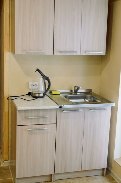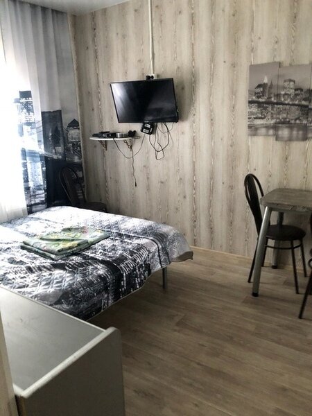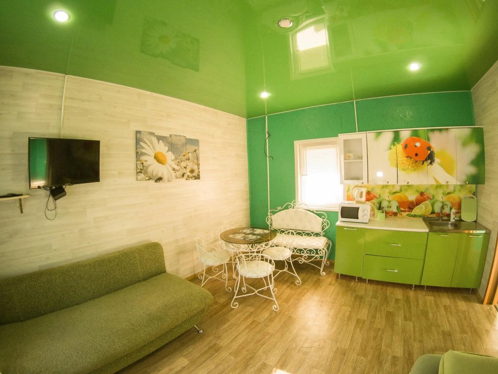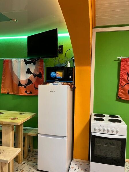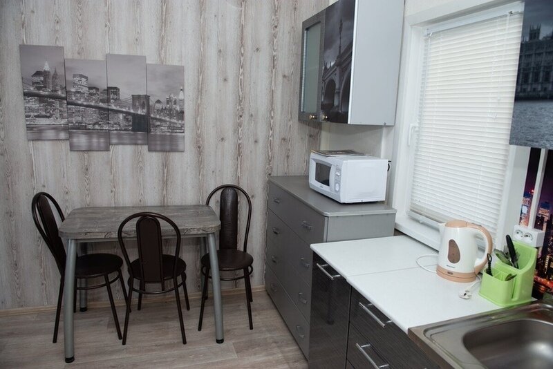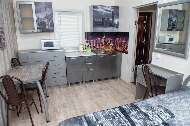 Есть телевизор, холодильник, микроволновка, плита, чайник, санузел с душем. Вся необходимая посуда и постельное белье так же в каждой комнате-квартире.