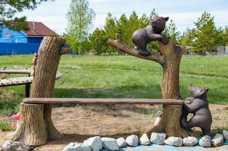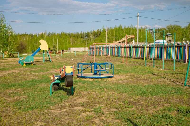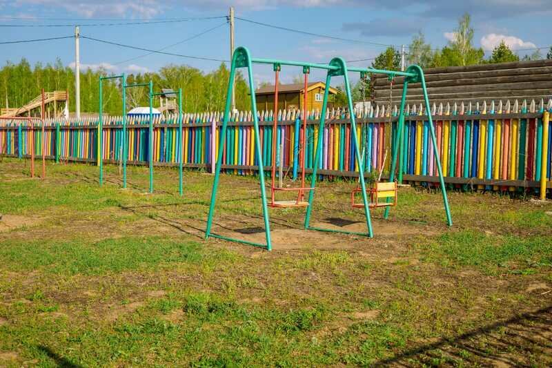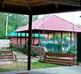 За комплексом располагается зона отдыха с качелями, лавочками и цветниками.