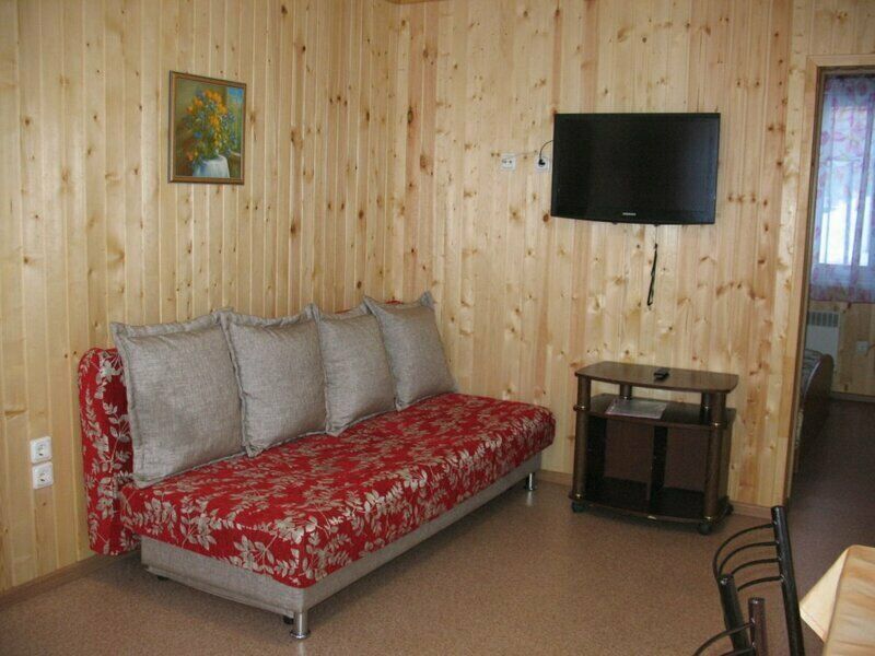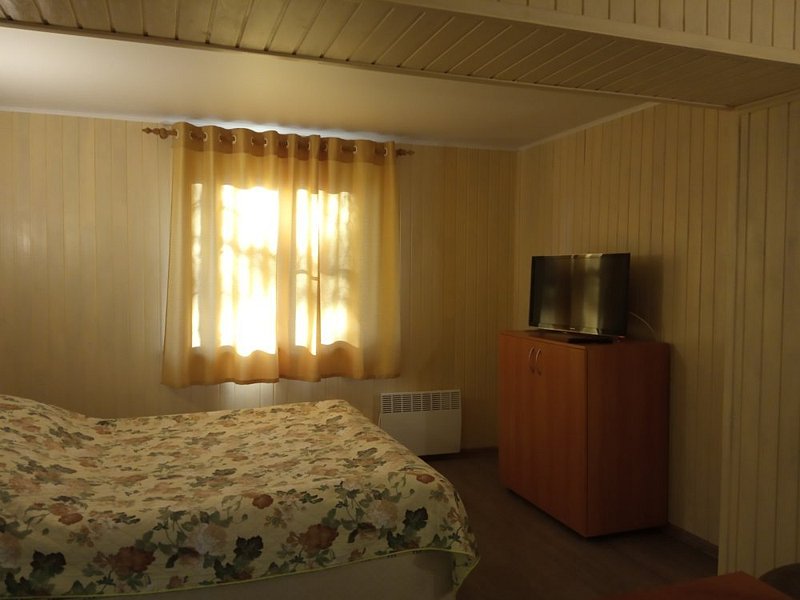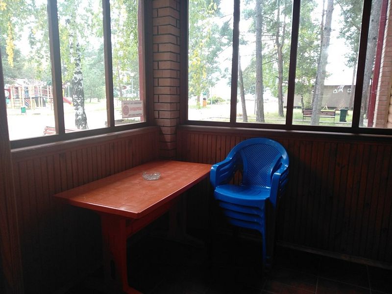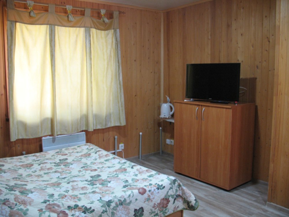 В номере: стоит двуспальная кровать, раскладывающийся диван, холодильник, телевизор, встроенный шкаф-купе, ванная комната с душем и туалетом, открытая и закрытая веранда.