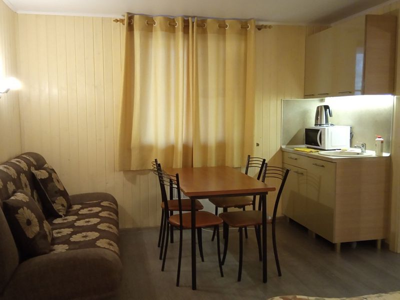 2 комнаты (в гостиной – диван, двуспальная кровать, кухонная зона с мойкой, в спальне – 2 односпальные кровати)