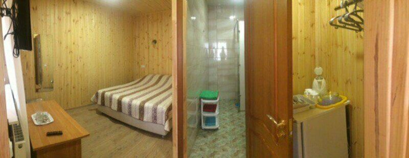 В номере: стоит двуспальная кровать, телевизор, холодильник, встроенный шкаф-купе, ванная комната с душем и туалетом, открытая и закрытая веранда.