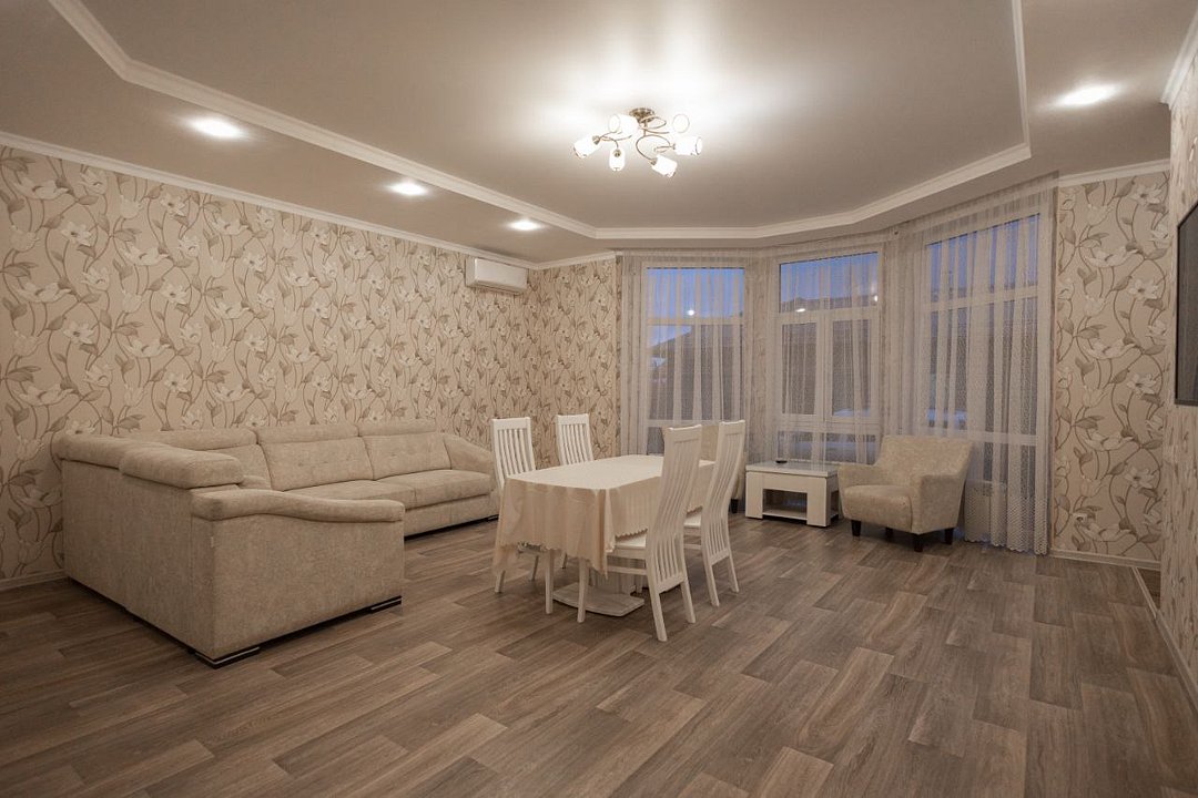 В доме большая гостиная, оборудованная кухонной зоной, микроволновая печь, электроплита, холодильник, посуда для приготовления и сервировки стола, большой диван, стол на 15 посадочных мест, три уютные спальни, в которых имеются 2-сп и 1, 5-сп кровати, телевизоры в каждой комнате, комоды. Есть шкаф для одежды. Две душевые комнаты и санузела. Рядом с домом мангальная зона.