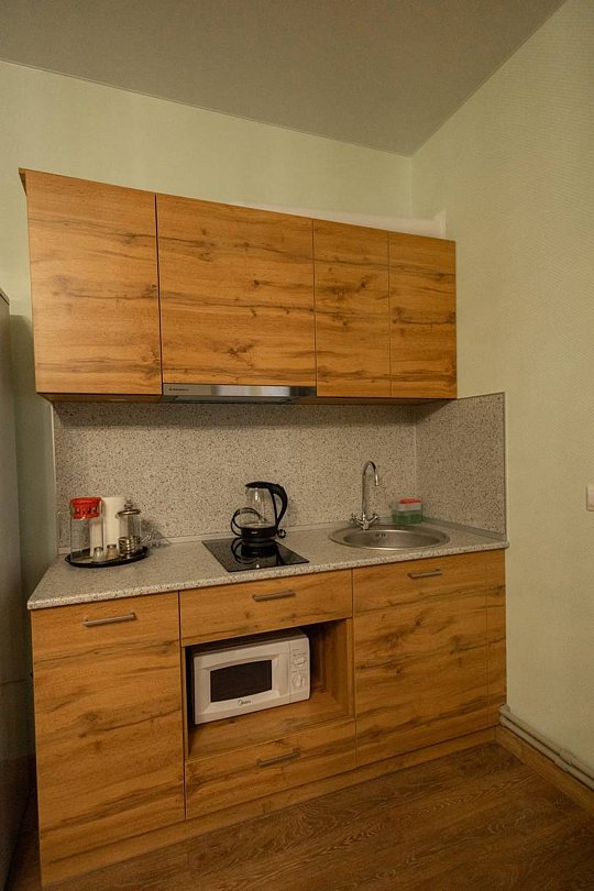 Уютный номер с двухспальной кроватью, собственной кухней и ванной комнатой.