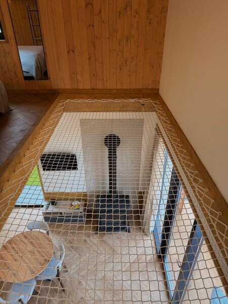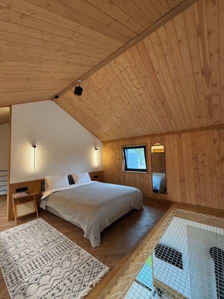 Отдельная спальная комната на втором этаже, с просторной лофт-сеткой в уровне второго света, а также проектором для просмотра фильмов.