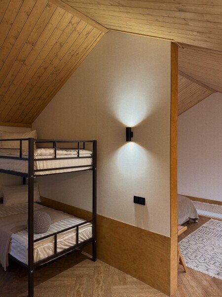 Дополнительные спальные места: двухъярусная кровать на втором этаже, раскладной диван на первом этаже.