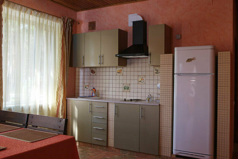 1-й этаж. Кухня-гостиная (плита:2 конфорки, вся посуда на 6 персон, чайник,кастрюли и сковородка, микроволновка, холодильник, стол, стулья),