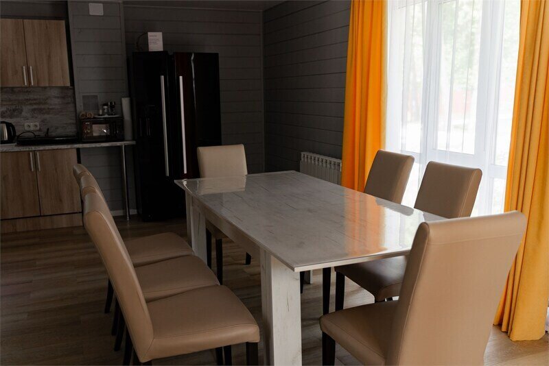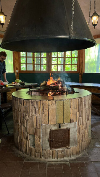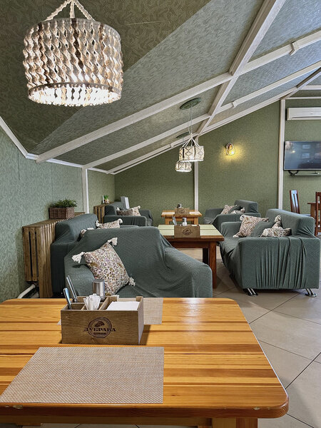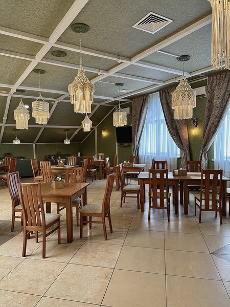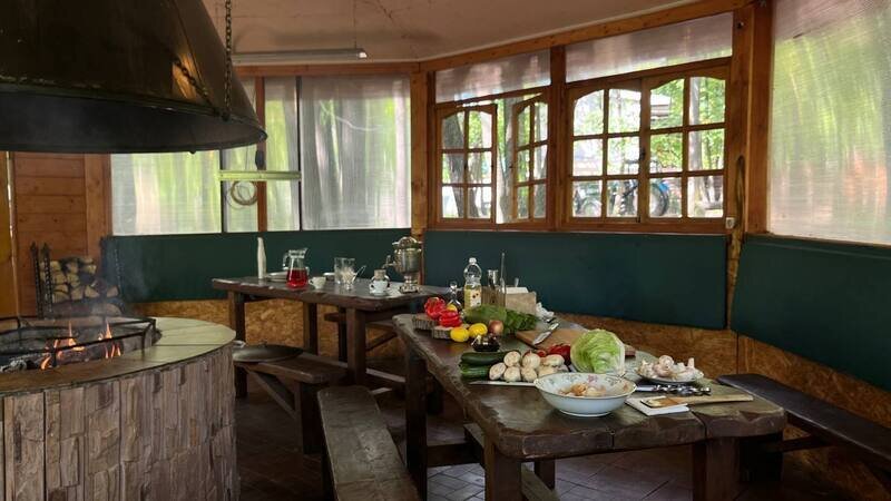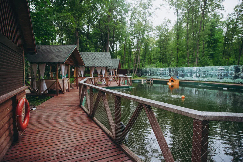 На территории работает уютный ресторан с русской кухней, есть мангальные зоны, а также необычный ресторан с возможностью рыбалки.