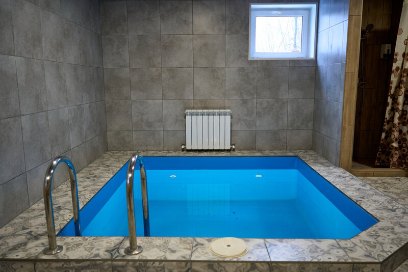 На первом этаже бассейн, две душевые, парная и зона отдыха. На втором этаже гостиная зона и зона отдыха.