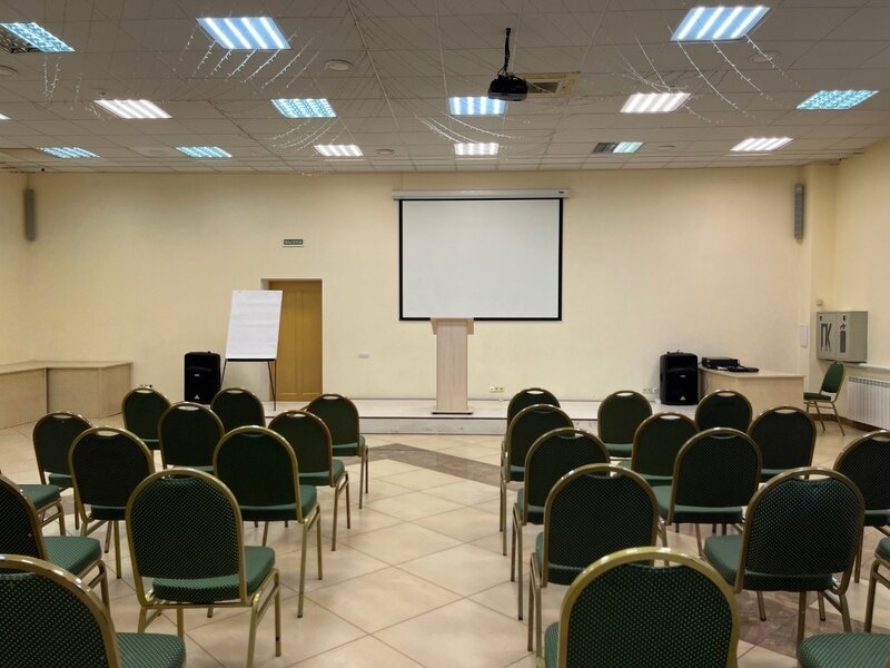 Просторное помещение рассчитано на аудиторию в 200 человек и оснащено всем необходимым техническим оборудованием: площадь экрана составляет 12, а площадь зала — 144 квадратных метра, есть флипчарт, Wi-Fi, мультимедийное оборудование, отличная звуковая система и удобные стулья.