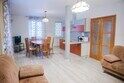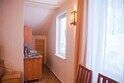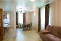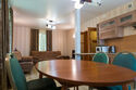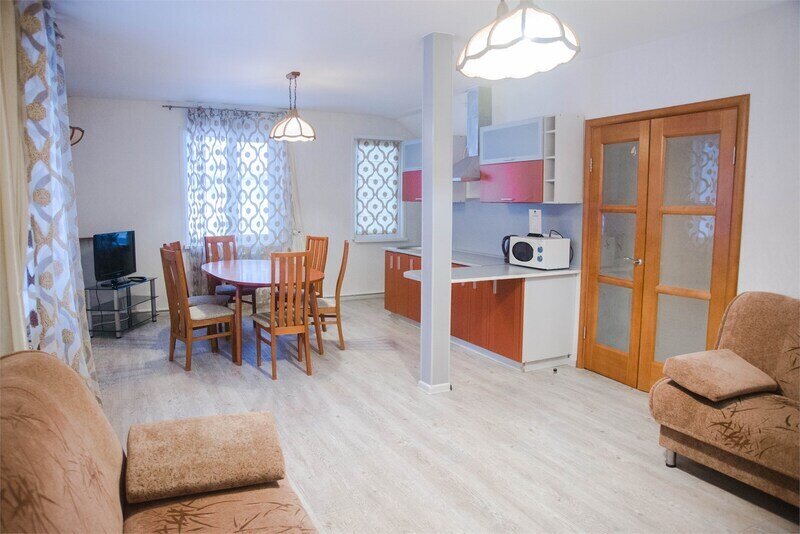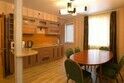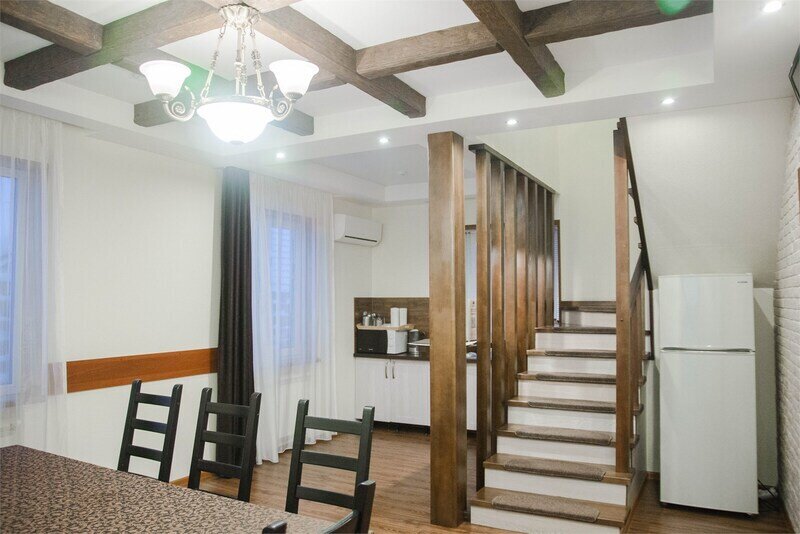 На первом этаже — просторная гостиная с мини-кухней и обеденным столом, санузел.