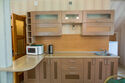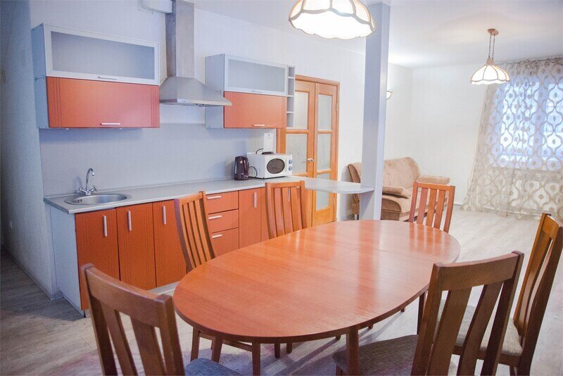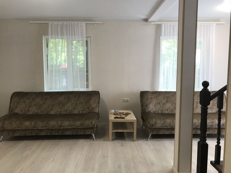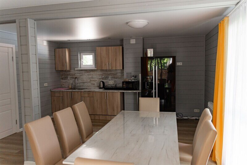 На первом этаже Гостиная с кухней и зоной отдыха: кухонный гарнитур, мягкая зона, обеденный стол (можно взять в аренду индукционную плиту), санузел.