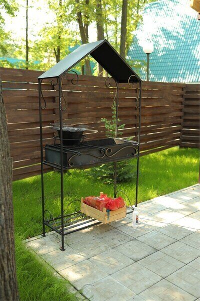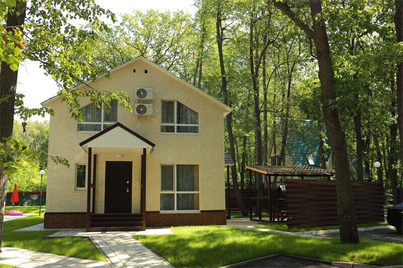 У каждого коттеджа есть открытая веранда и рядом расположен мангал