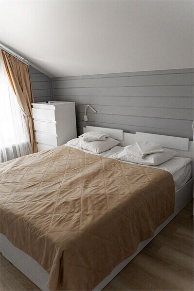 Гостиная с удобной мягкой зоной, совмещенная с кухней и санузел. На втором этаже коттеджа располагаются 2 уютные спальни и санузел.