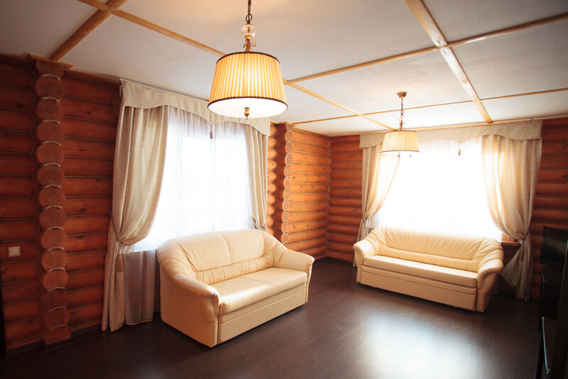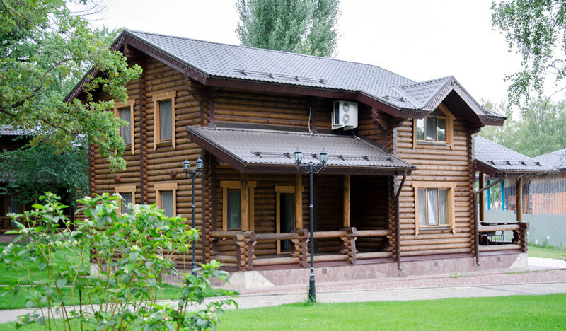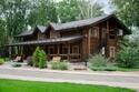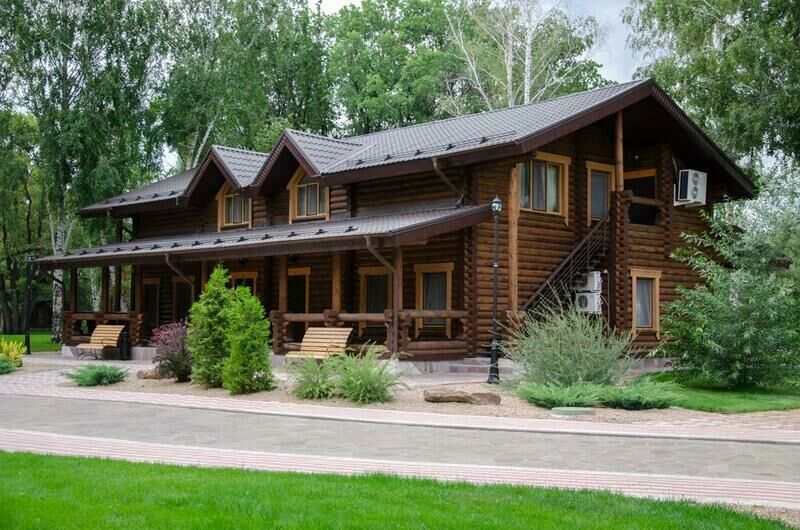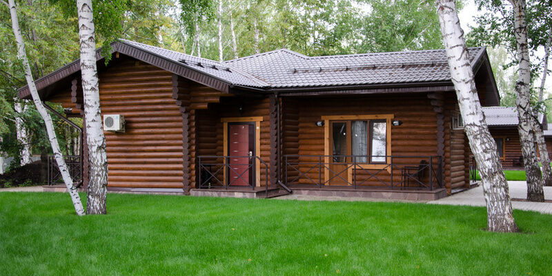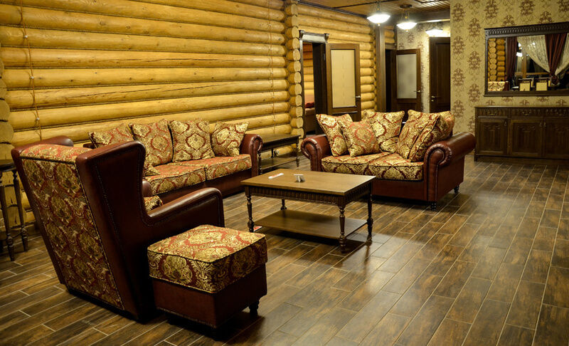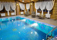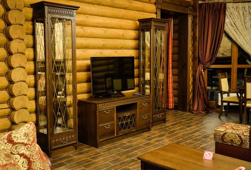 Отдельно стоящий роскошный одноэтажный срубовой дом с бассейном и саунами, выполнены в роскошном «английском» стиле и «охотничьем» стиле, с русскими народными мотивами в интерьере.
