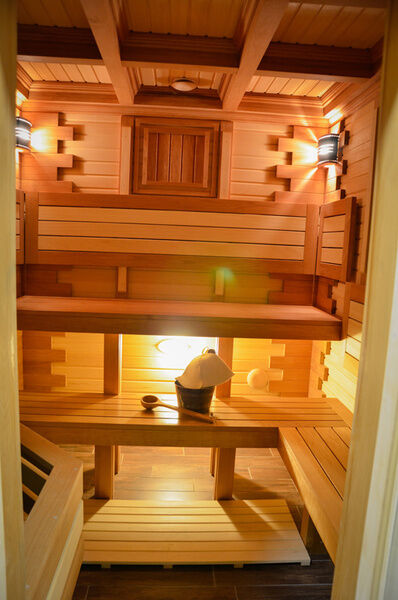 Есть в «Васильевском» и индивидуальная сауна, с отдельной комнатой отдыха, мягким диваном и большой плазменной панелью.
